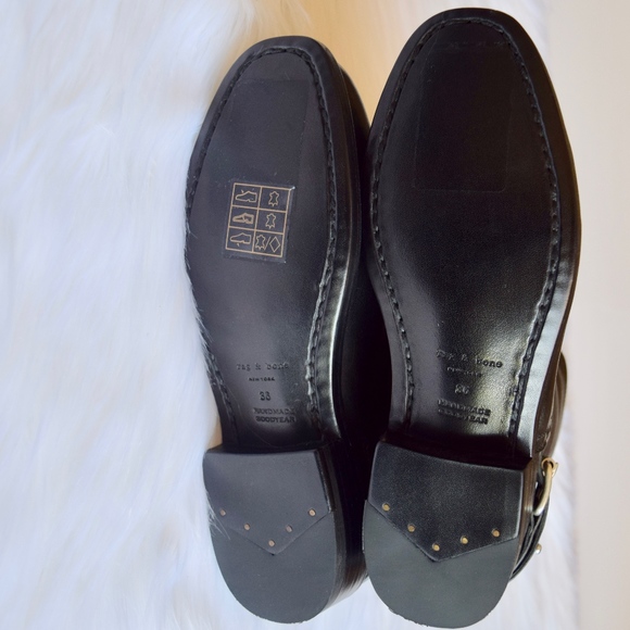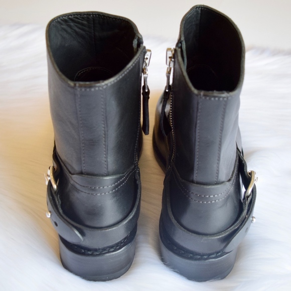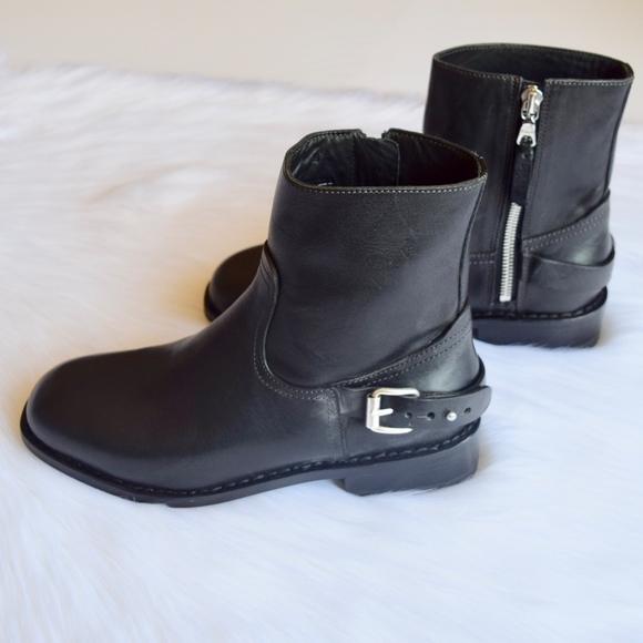 Rag & Bone Oliver Zip Moto BootiesSize: 36 New in BoxLightly distressed-leather Rag & Bone moto boots with a buckle strap accent at the heel. Exposed side zip. Stacked heel. Leather sole.