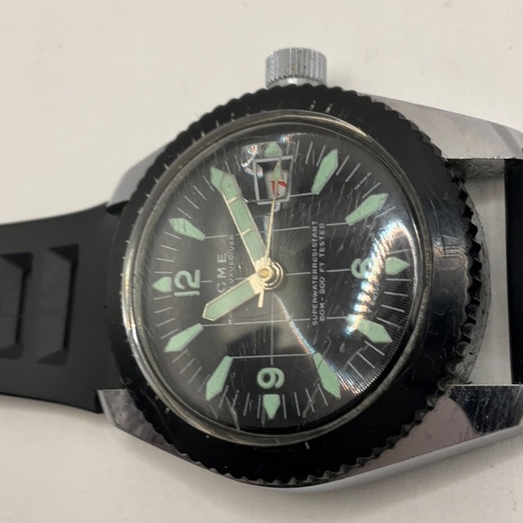 ACME Watch Lucerne Men’s Diver. Condition is Running, & "Pre-owned". A Very cool vintage Diver I found a while back. Looks to be an ACME Lucerne. 37.5mm without crown. Running, & Keeps excellent time, I do not know the service history, and suggest with all vintage watches to be taken in for a service!Looks like seal has not been broken. Winds great with no issues. It does have some scratches, and the acrylic crystal has been polished at least once...