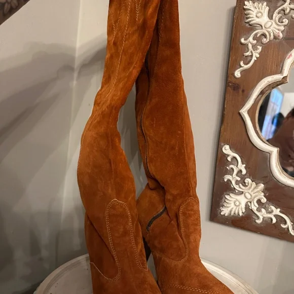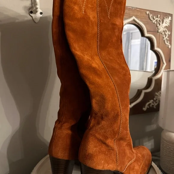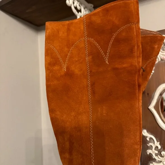Beautiful authentic suede rust/caramel colored knee high boots with contrast stitching. 4” heel in dark brown. Inside zipper. Pet free, smoke free home.