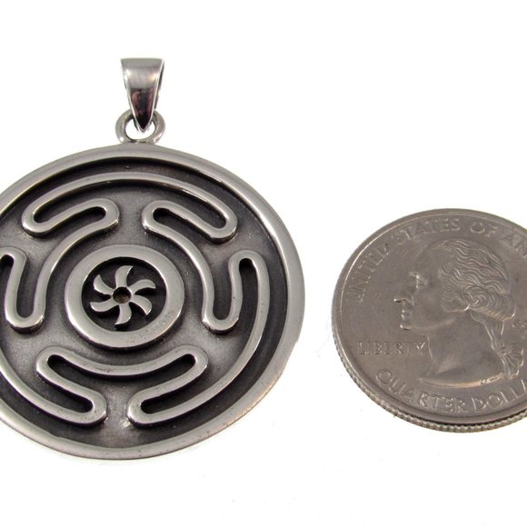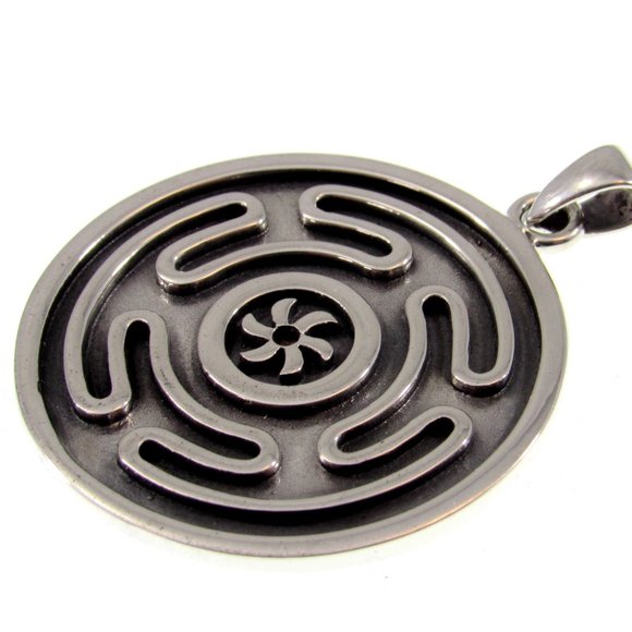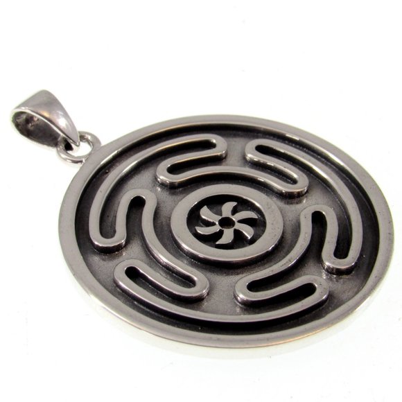 The Hecate wheel is a circle within which is a circular labyrinth (symbol of rebirth) surrounding a spiral (symbol of Devine thought).The Hellenic Recon and Dianic traditions of Wicca use this powerful symbol today. This beautifully crafted Hecate´s wheel pendant weights in at over 14 grams of solid sterling silver, and would make an awesome heirloom piece.Item specifics: Length (including bail): 1 3/4" inchesWidth: 1 3/8" inchBail opening: 4mmWeight: 14.8 gramsSolid sterling silver (Quality stamped 925)