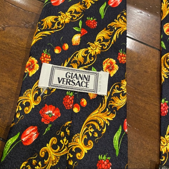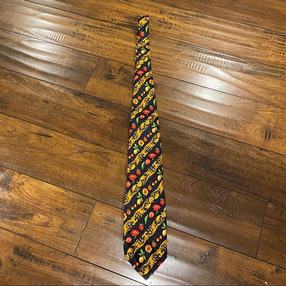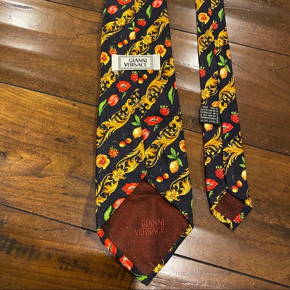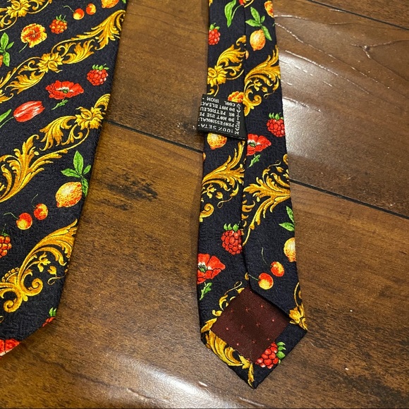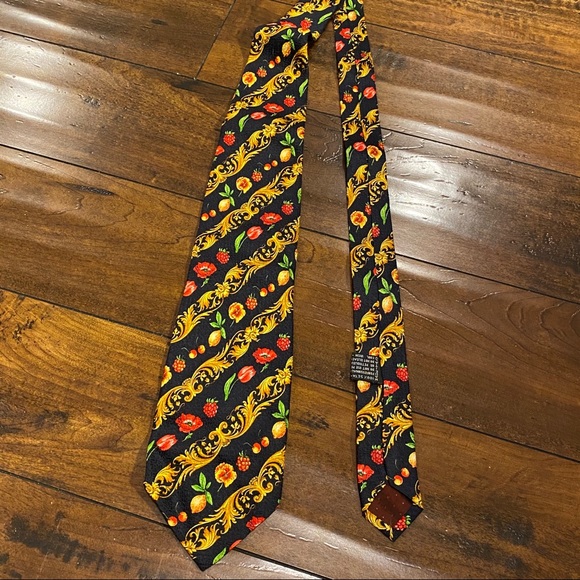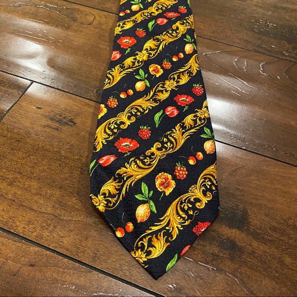 A gorgeous 100% silk tie by Gianni Versace, featuring flower and fruit accents throughout. Excellent condition. Vintage.