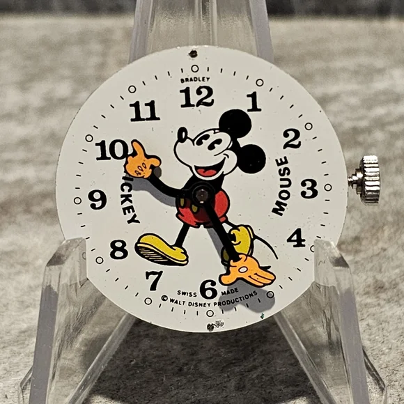 Featuring a 1970s Vintage Bradley Time Disney Mickey Mouse Pie Eye Wrist Watch Orignal CaseThe watch features a manually wound movement that is not currently running.While the movement is not currently running, the hands can be turned and set.The watch has a large round sliver case roughly 38-42 mm in size.It also features an etched Medusa like character on the watch case back.The dials is bright white with 12 hour numeric markings and features a colorful Pie Eye Mickey Mouse graphic with animated arms and yellow gloved hands.The watch comes with the original hard plastic case with Mickey Mouse satin like headliner.Overall the condition of this item is very good given its age.The watch and case have normal amounts of surface wear and scratches for the age and no known or visible major damage.Please be sure to view all photos for the features and condition of the item