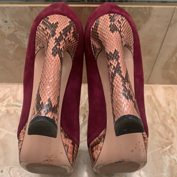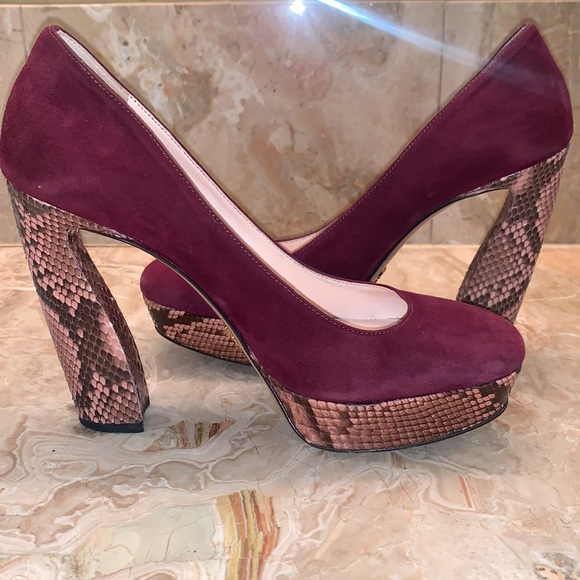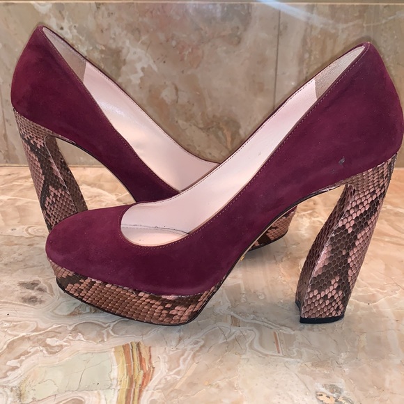 Rare Prada pumps- suede and snakeskin details- pre owned with few signs of wear as shown in the pics/ video- comes with box- heels is about 4 1/2”- front platform is about 1”- color is like purple wine