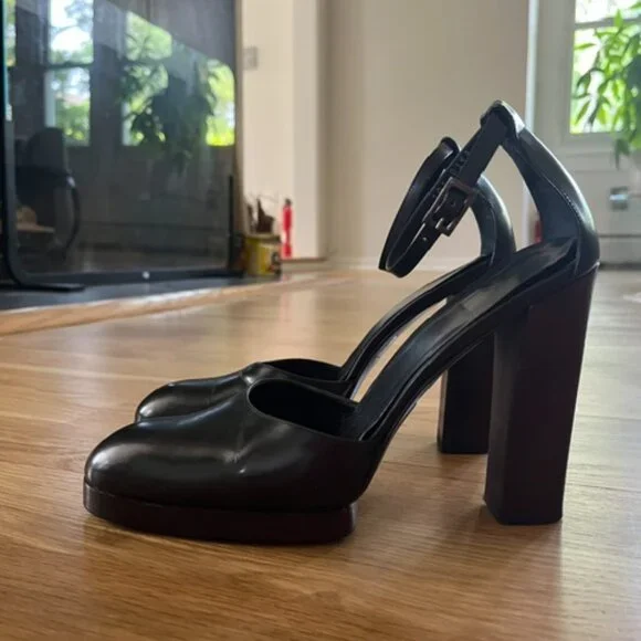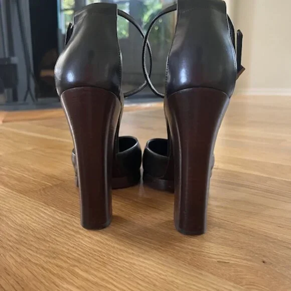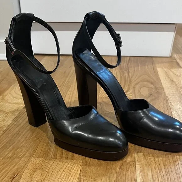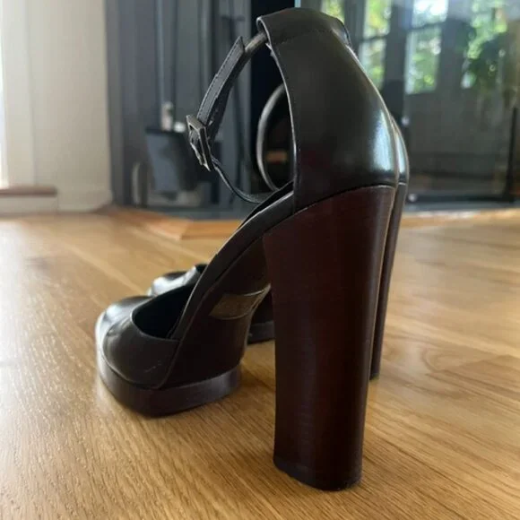 Gucci9.5 closed toe Mary Jane,125mm pumps with a small platform (1/2 in). Black leather shoe and dark wood platform and heel. Heel is perfectly intact ( top piece :1 1/4 in length...