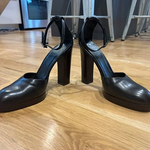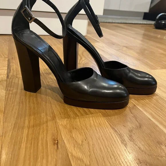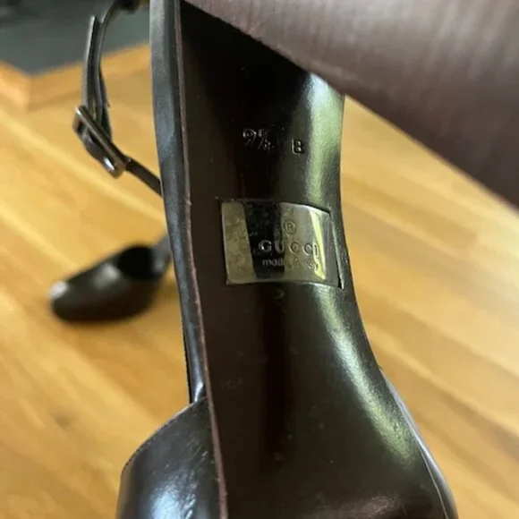 Gucci9.5 closed toe Mary Jane,125mm pumps with a small platform (1/2 in). Black leather shoe and dark wood platform and heel. Heel is perfectly intact ( top piece :1 1/4 in length and 1 1/8 width). Sexy and sophisticated. Worn less than handful of times only because they´re too big! They´re beautifully made and they didn´t have my size so I bought 1/2 size up so not to give them up!
