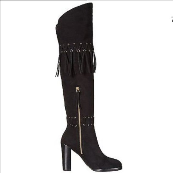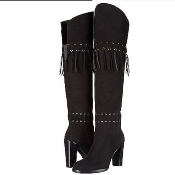 New without box.Grommets and fringe bring rock-n-roll edge to these suede Rebecca Minkoff boots. The over-the-knee silhouette has an angled shaft and an elastic inset. Side zip....