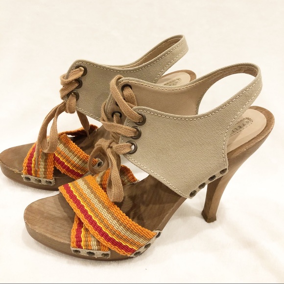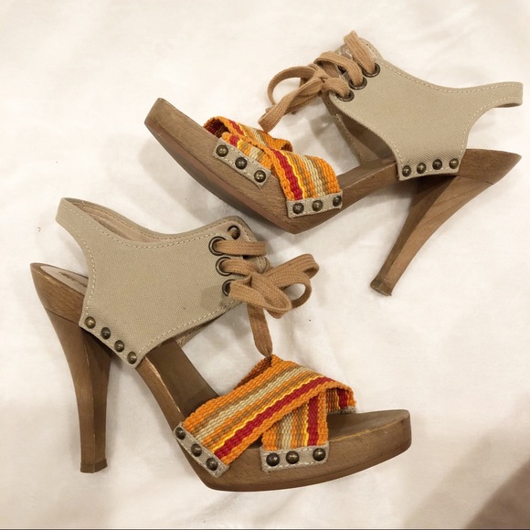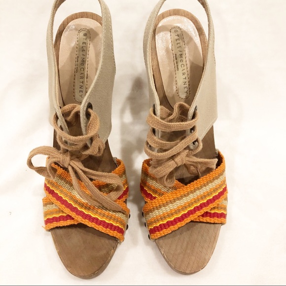 Stella McCartney Wooden Platform Canvas Heels. Please see all photos for condition. Worn twice. Beautiful for summer only a few minor scratches on side of wood. Offers welcome. Approx 4” heels. Size 37.5