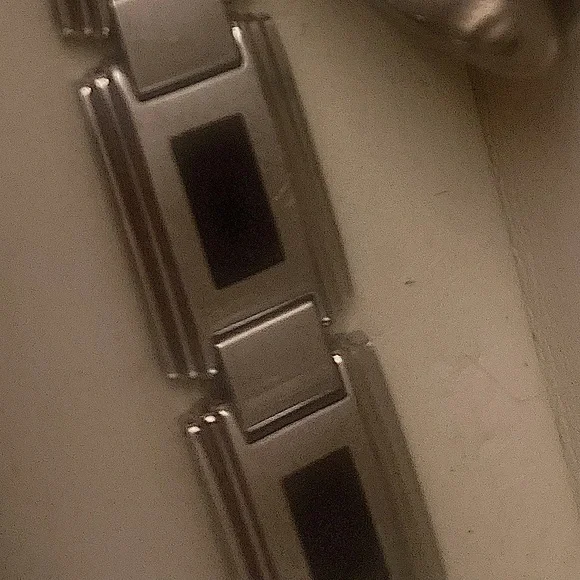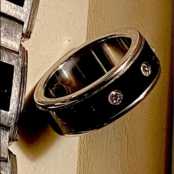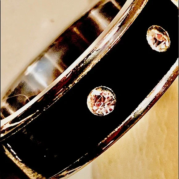 Beautiful onyx set in stainless and the ring has 3 diamonds set flush in the onyx