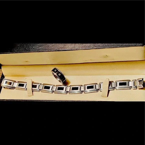 Stainless steel and onyx ring and bracelet for a man