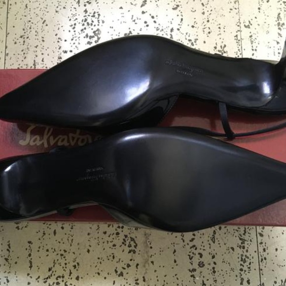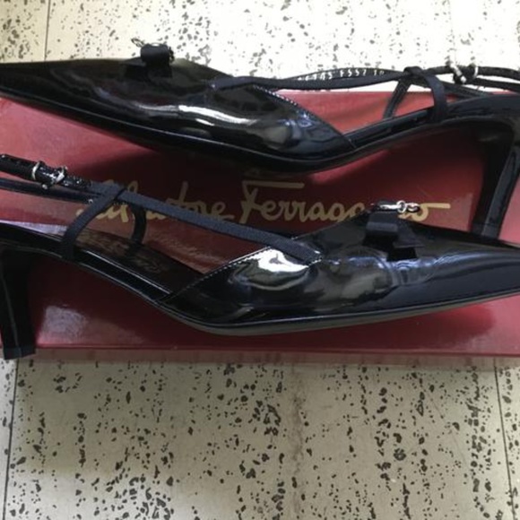 Brand new refined point-toe slingbacks in black patent leather in original box.Leather lining, leather sole, buckled slingback strap with self-covered stiletto heel.Signature logo...