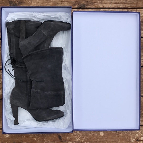 Slate grey stretch suede, over the knee with adjustable tie back detail, 2.6” block heel, almond toe shape. Leather insole. Shaft height 22.5”. Shaft circumference 14”. Made in Spain. Sold with box. Excellent condition. Size 8.5.