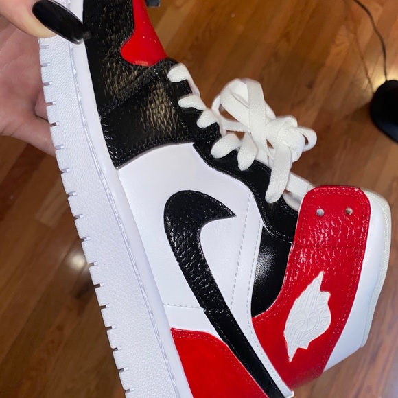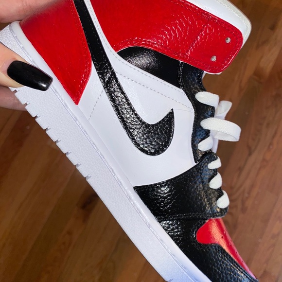 Custom painted red and black Air Jordan 1 Mids. Never worn, still in original box. Listed as Men’s 7.5, equivalent to Women’s 9.