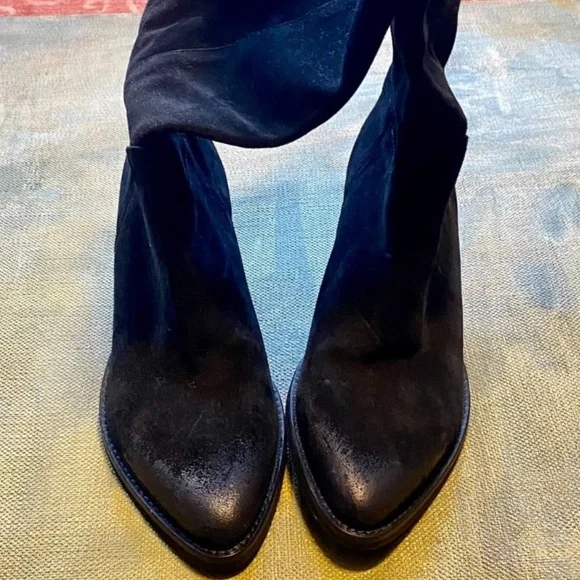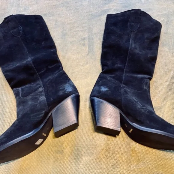 Beautiful and in pristine condition!! We The Free artisan made, distressed black suede cowboy boots with stacked heel.