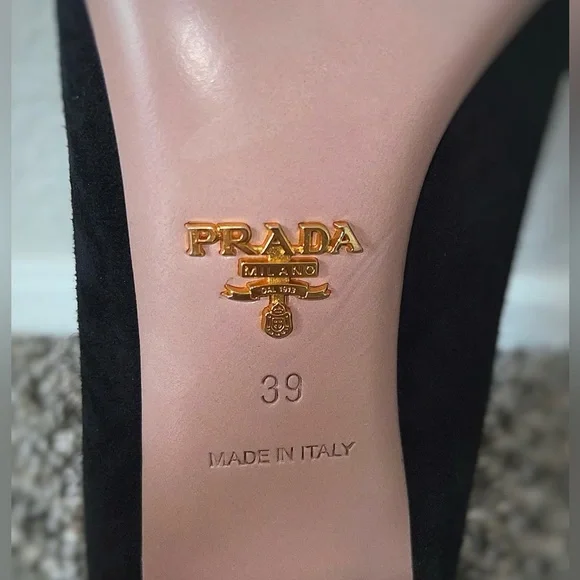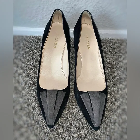 • Black Leather - Velvet• Excellent conditionsThe shoes are designer-signed featuring pleated applique and bottom leather sole with gold - tone Prada.