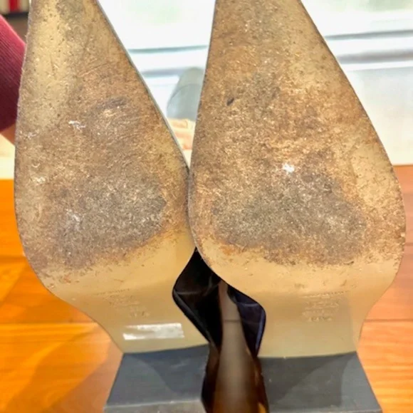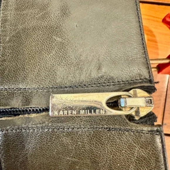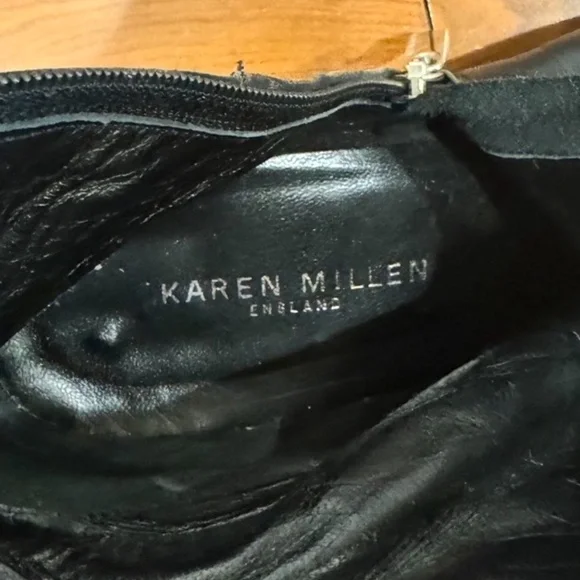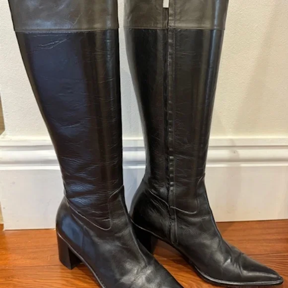USED GORGEOUS POINTY KAREN MILLEN IN GOOD CONDITION, ITALIAN LEATHER BLACK AND GREYKNEE HIGH BOOTSTHESE BEAUTIFUL FULLY LEATHER B;ACK BOOTS WITH GREY LEATHER BAND AT THE TOP LOOK SO ELEGANT AND CLASSIC.UPPER, SOLE AND LINING ITALIAN LEATHER.QUALITY WORKMANSHIP WITH A FULL LENGTH ZIPPER ON THE INSIDE OF EACH FOOT.COMFORTABLE BLOCK HEELS 2 1/2" HIGH, POINTED TOES SO PROBABLY BETTER FIT FOR NARROW FEET.THEY CAN BE WORN FOR ALL OCCASIONS AND WILL SURELY GET YOU MANY COMPLIMENTS. NO RETURNS
