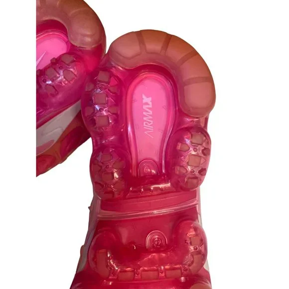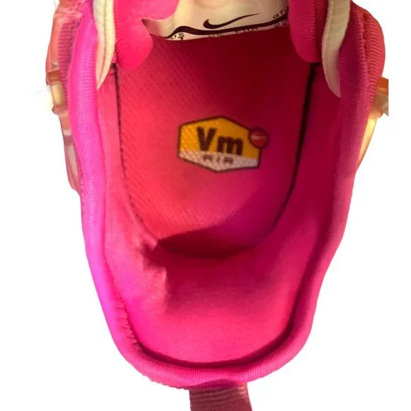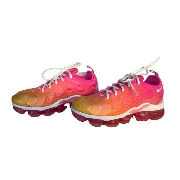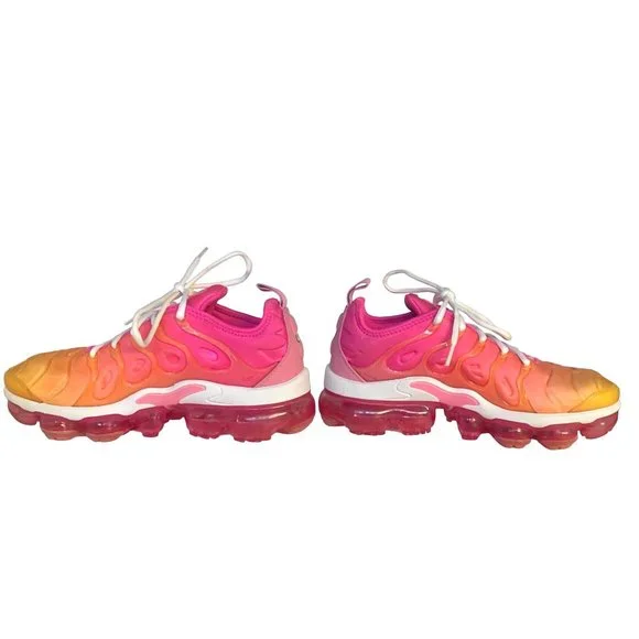 released in 2019The Wmns Air VaporMax Plus ´Summer Sunset´ sneakers exhibit a bright gradient appearance. The upper of the shoe gradually shifts from Laser Fuchsia and Psychic Pink to orange, adorned with translucent TPU sections on the midfoot and toe. The shoe is made using a hybrid construction that includes a white Air Max Plus midsole with a pink shank plate, followed by a full-length VaporMax unit for cushioning. These shoes have been barely worn and are in excellent condition, with minimal signs of wear. Please review all photos and zoom in to witness the stunning appearance of these shoes.US Size 7 UK SIZE 4.5 EUR 38Features:• Air VaporMax Plus• nike• Wmns Air VaporMax Plus ´Summer Sunset´• VaporMax• Laser Fuchsia and Psychic Pink to orange• VaporMax• womans size 7Size: US 7 EUR 38Condition: Pre-Owned GoodThese shoes have been barely worn and are in excellent condition, with minimal signs of wear. Please review all photos and zoom in to witness the stunning appearance of these shoes.