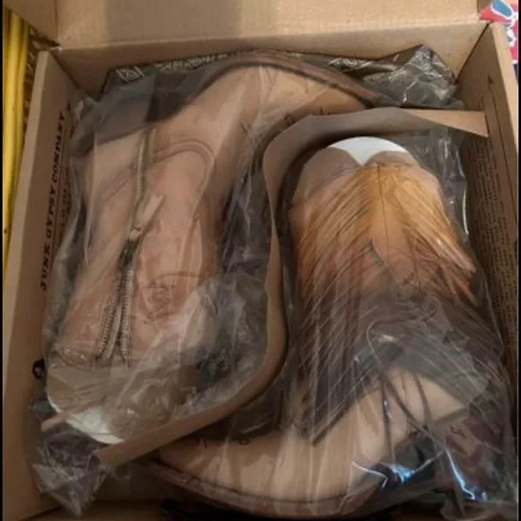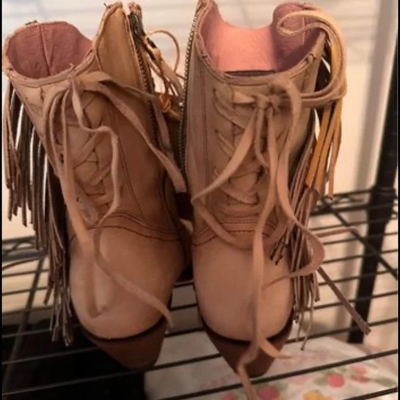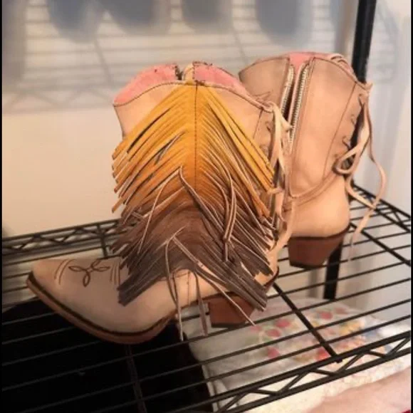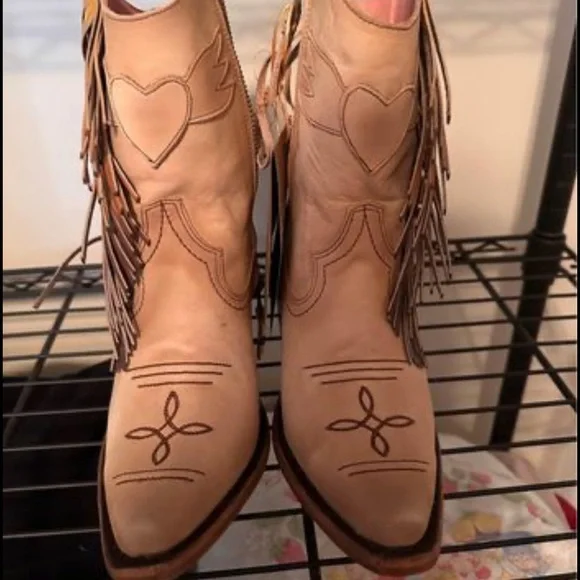BRAND NEW Boots size 6 women’s.Cream color with ombré fringe.Heart wings on front.Pictures don’t do them justice!Distressed leatherHand-painted ombre fringeHeart and wing...