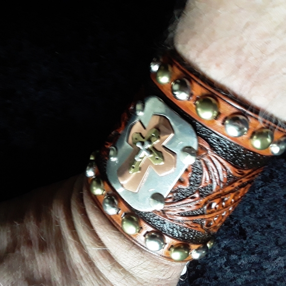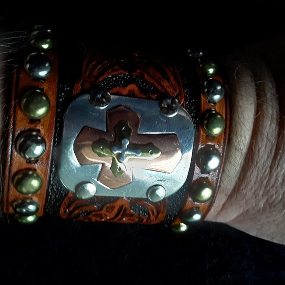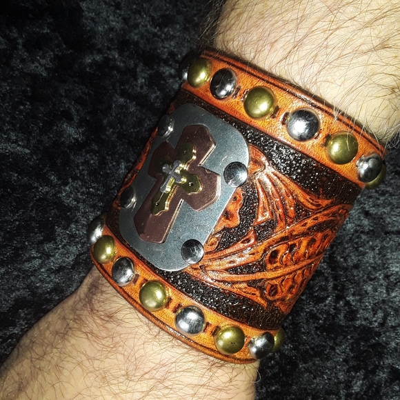 This piece is special to me, as it signifies my love of two genres of music. Metal, and Country. Hand tooled in the traditional Sheridan Floral design. One size but measures9 inches long. Mens or Womens.Hand carved by my hands, for Dark Horse Leather Jewelry and Woodcraft.