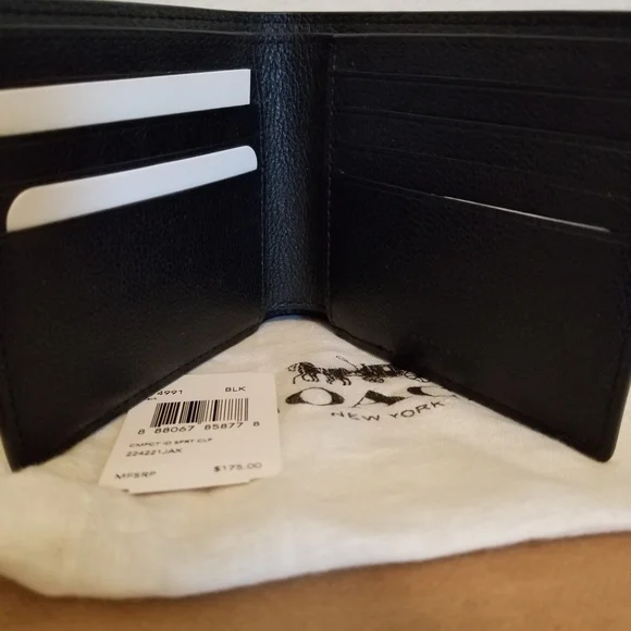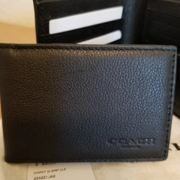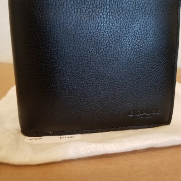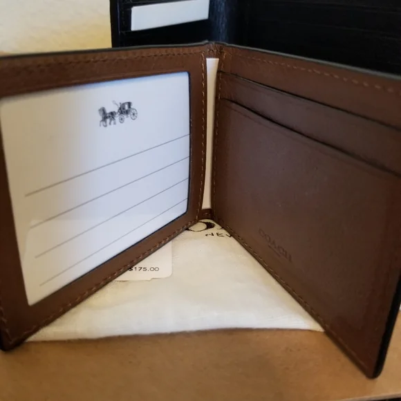 Mens Coach leather wallet with insert. Black smooth pebble leather with brown interior on insert. Bill divider in wallet. Dust cloth included. Very classy