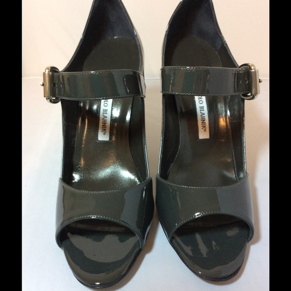You are bidding on a gorgeous authentic Manolo Blahnik gray patent classic pump.So incredibly beautiful.Comes new in original box with dustbag 105MM (4 1/4 inches)