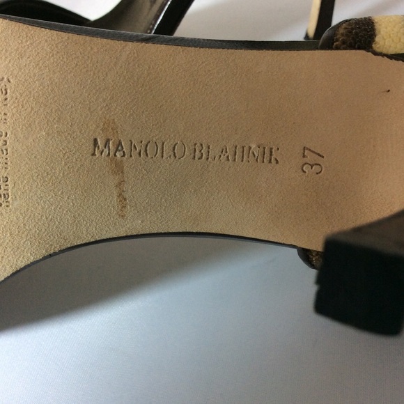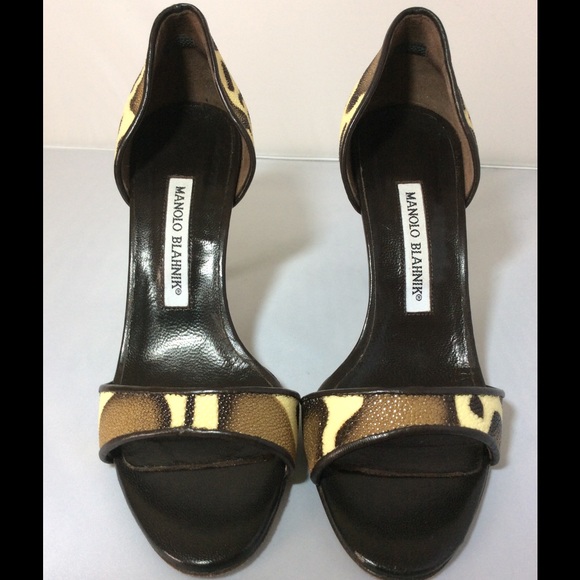 Fabulous NIB Stingray leopard printed sandal/pump shoe.Stunning!While I think that most Manolos run small, this particular shoe runs true to size.I normally have to wear 1/2 to a full size up and I am true to my size in this and it is suprisingly very comfy!Comes NIB with dustbag.Retails for 875.0090 MM heel (3.5 inches)