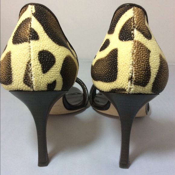 Fabulous NIB Stingray leopard printed sandal/pump shoe.Stunning!While I think that most Manolos run small, this particular shoe runs true to size.I normally have to wear 1/2 to a...