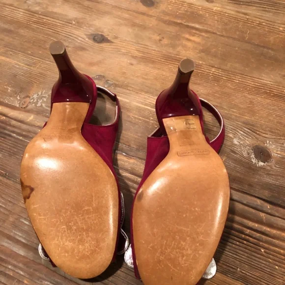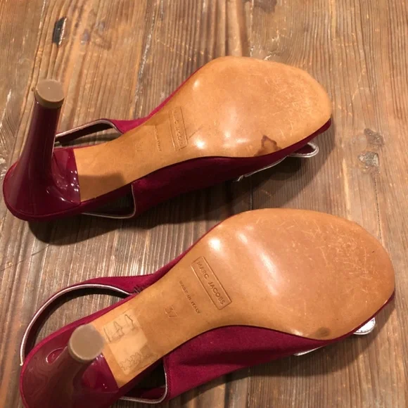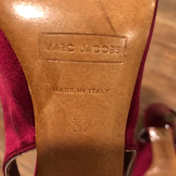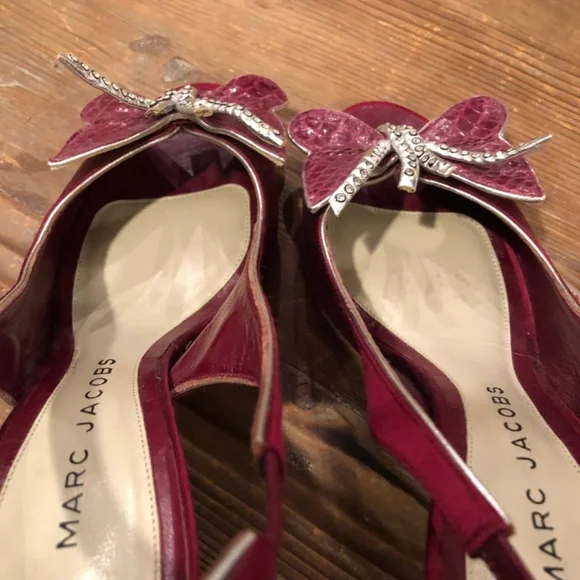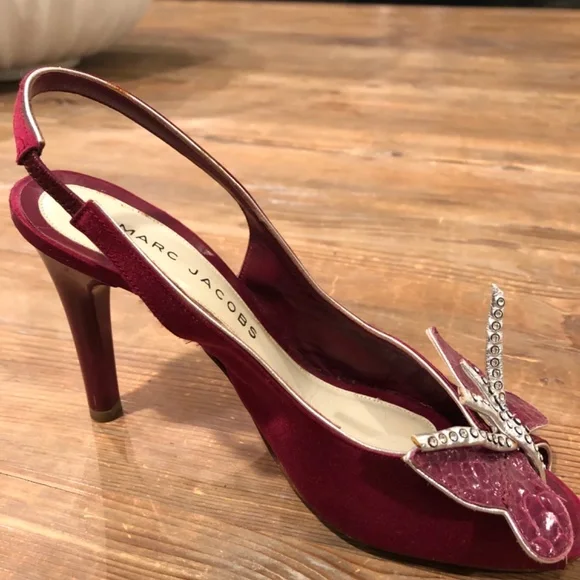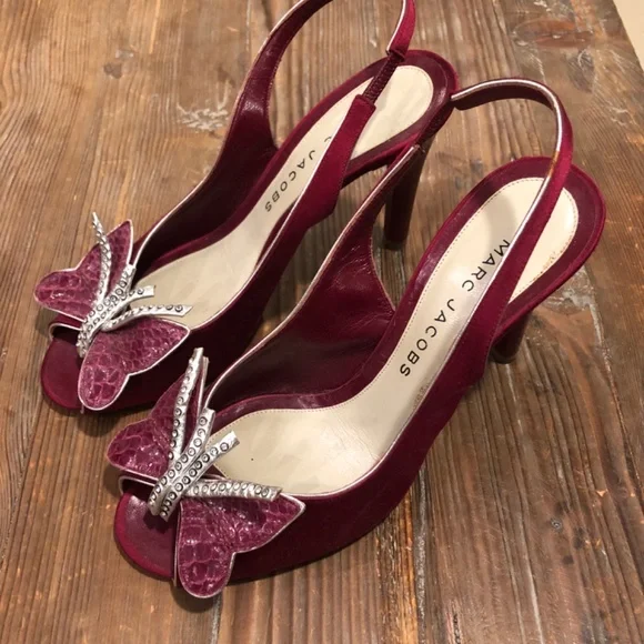 Never worn! Gorgeous plum satin Marc Jacobs evening shoes with amazing butterfly detail and 4” heel. Narrow fit. Size 37/7.