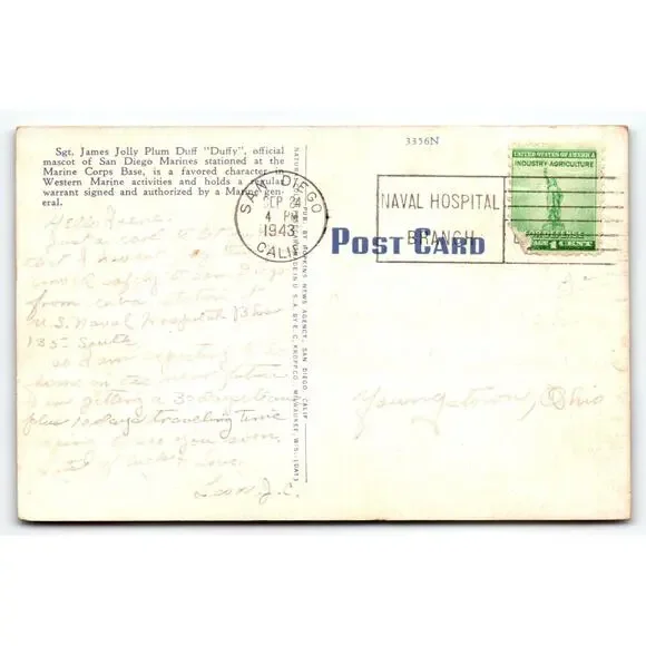Sgt James Jolly Duff Duffy Bulldog Dog San Diego Marines Military Postcard 1943