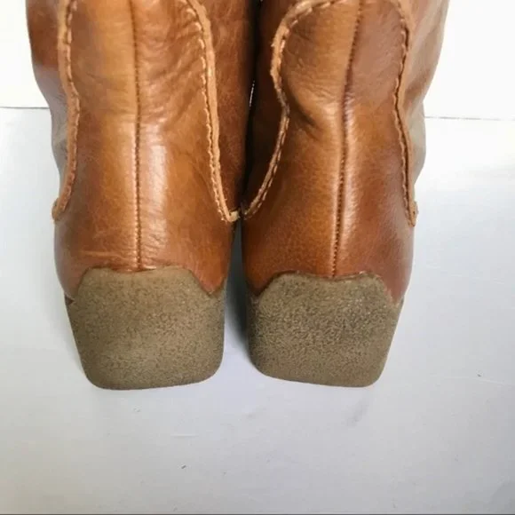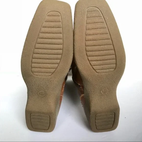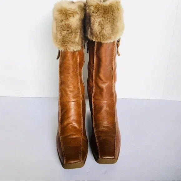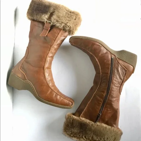 These TAMARIS Mid Calf Cognac Brown Leather Square Toe Side Zip Wedge Boots with Fur have only been worn once and are in Excellent Used Condition with minimal wear. Square toe zip...