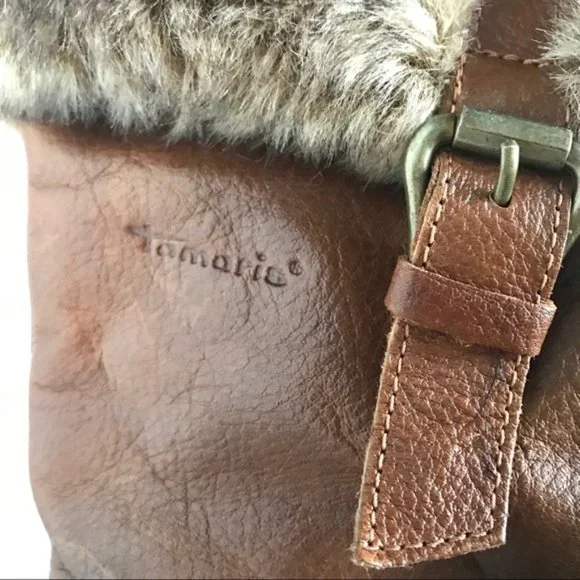These TAMARIS Mid Calf Cognac Brown Leather Square Toe Side Zip Wedge Boots with Fur have only been worn once and are in Excellent Used Condition with minimal wear. Square toe zip boot in hand burnished cognac brown leather with decorative side buckles. Supple tumble grain leather with fur top. This boot is lined in breathable fabric and features a padded leather insole.Non-slip rubber soleHeel Height: 2"Style No: 254122Beautiful, made of soft genuine leather. Very comfortable and stylish. Buy before it´s too late. Such unique shoes are rare!