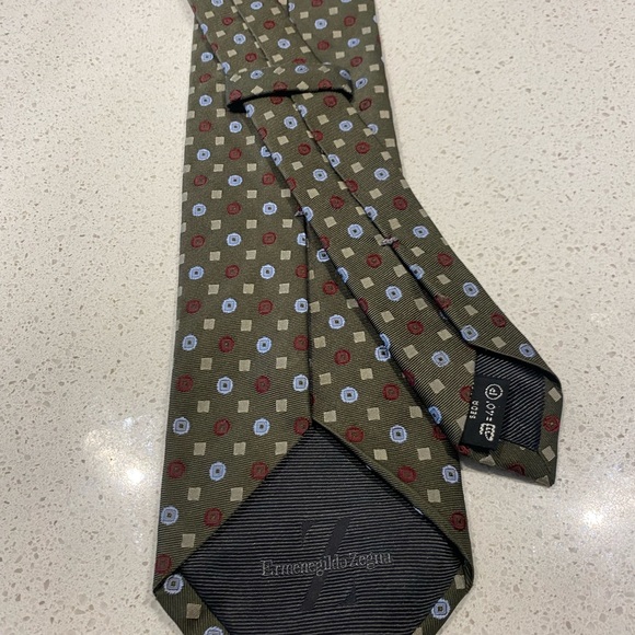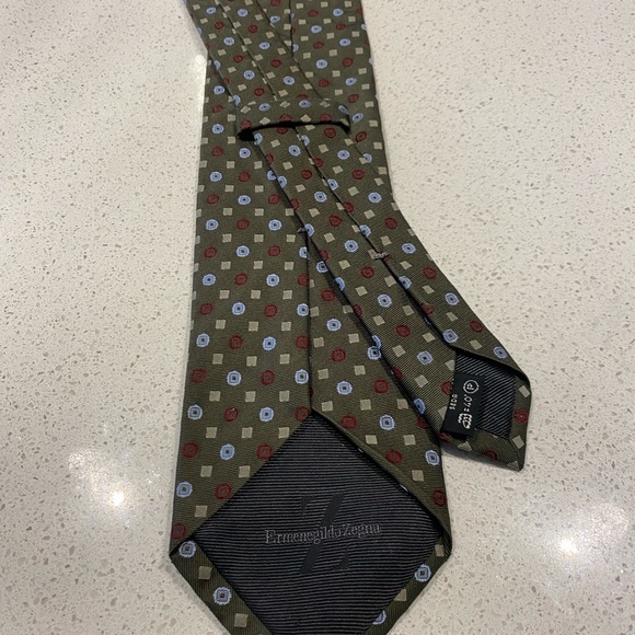 Zegna olive green print silk tie.