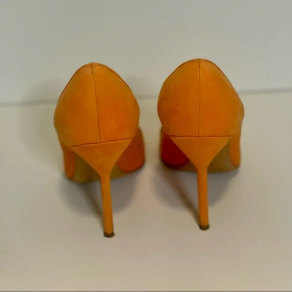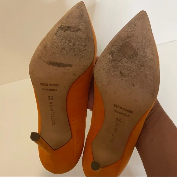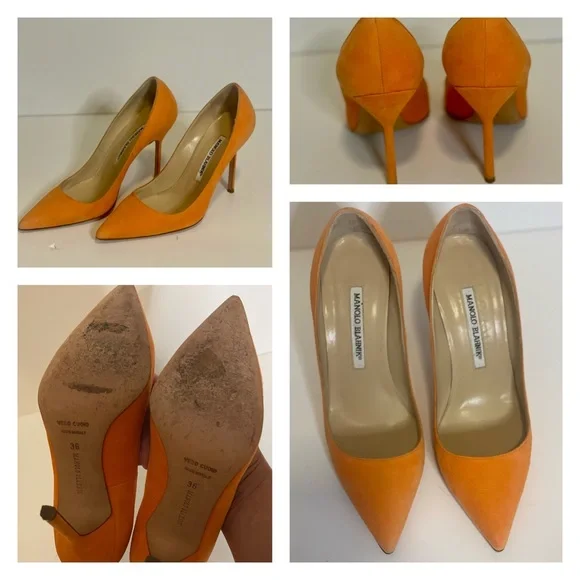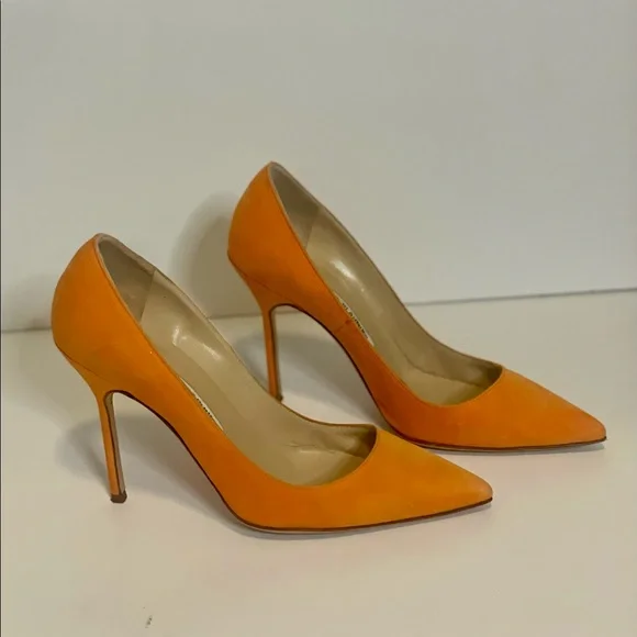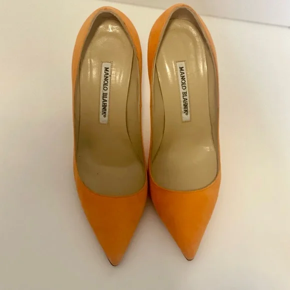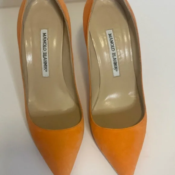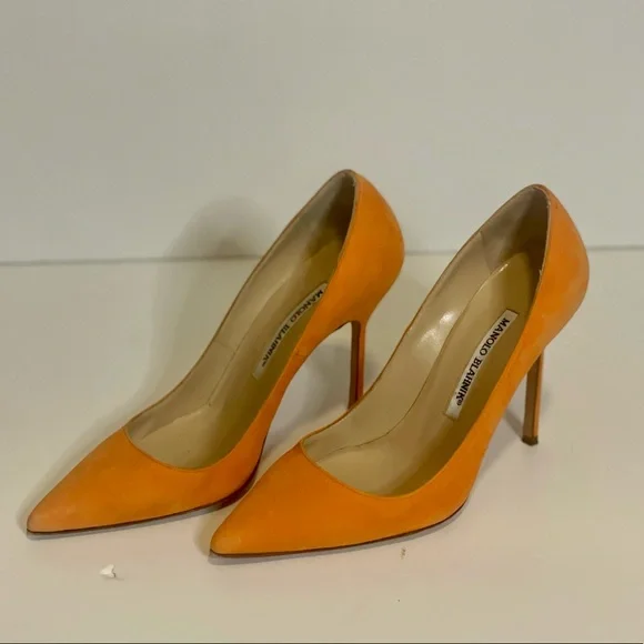 These Manolo Blahnik BB suede heels are stunning and have such a timeless, classic shape. My mother-in-law has them in a few colors and is weeding out her collection. Don’t think I haven’t tried to Cinderella my feet into these beauts, but they just aren’t my size. BRAND: Manolo BlahnikCONDITION: Very Good/Like NewCOLOR: OrangeMATERIAL: SuedeSIZE: 36STYLE:BB 105475Heel is 4”