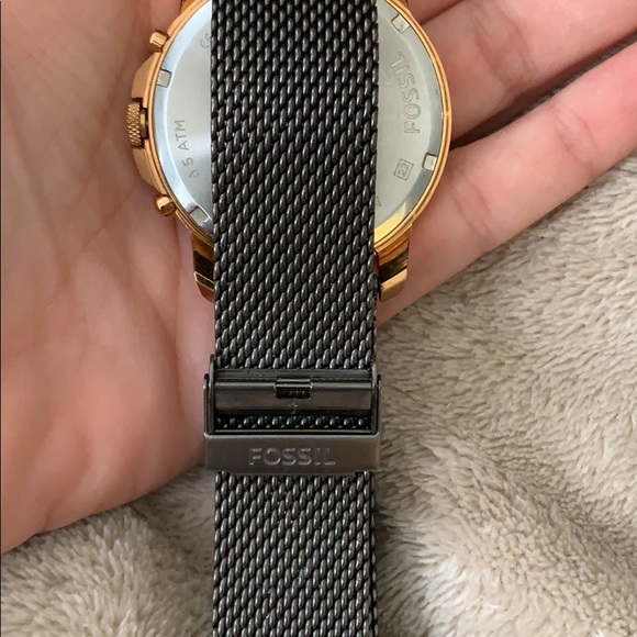 This watch is in nearly perfect condition. It will need a new battery, but can easily be replaced at any fossil location. It does have a mesh band that also can be adjusted larger...