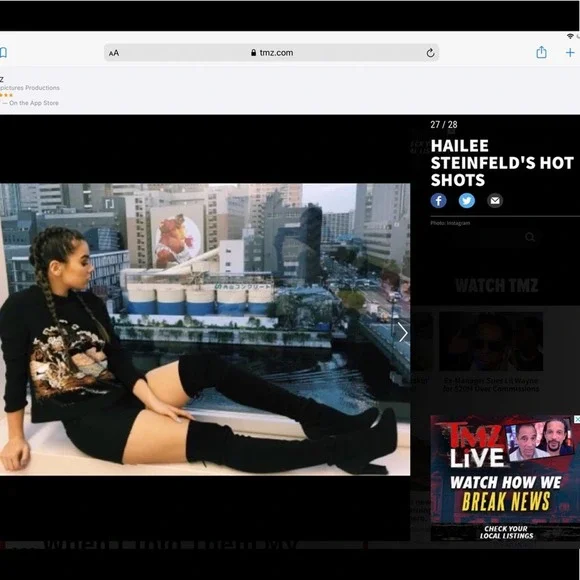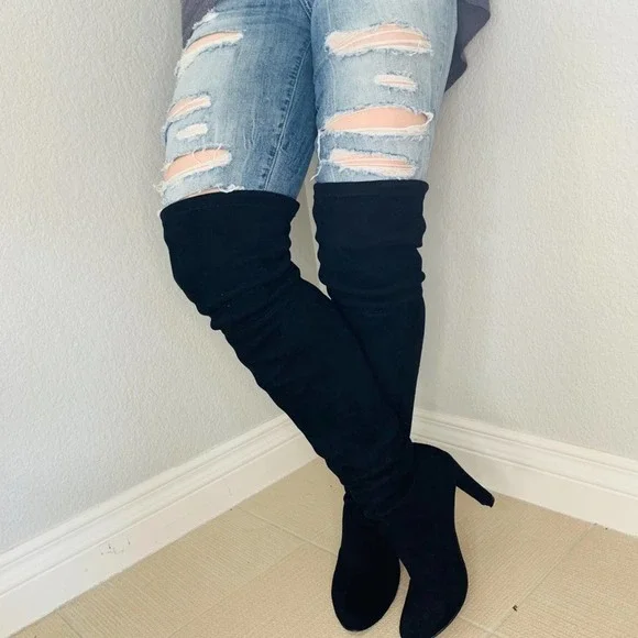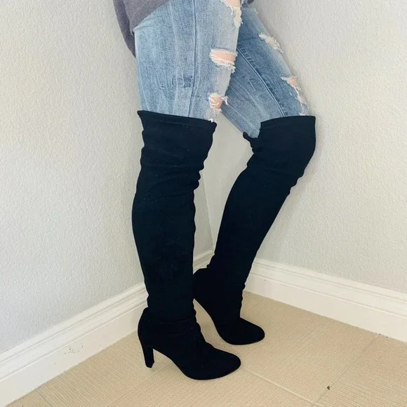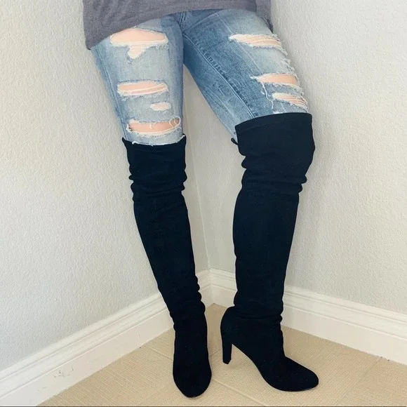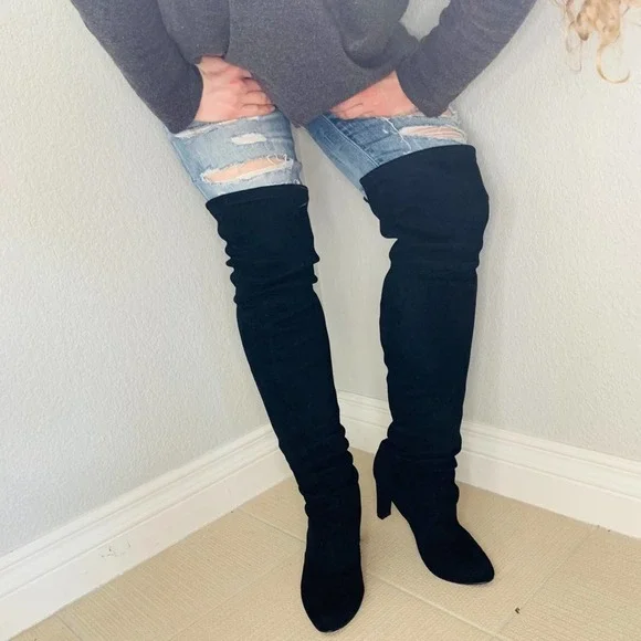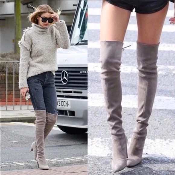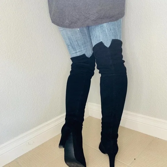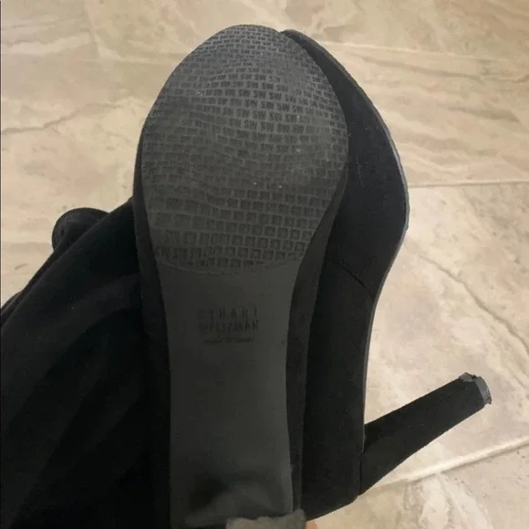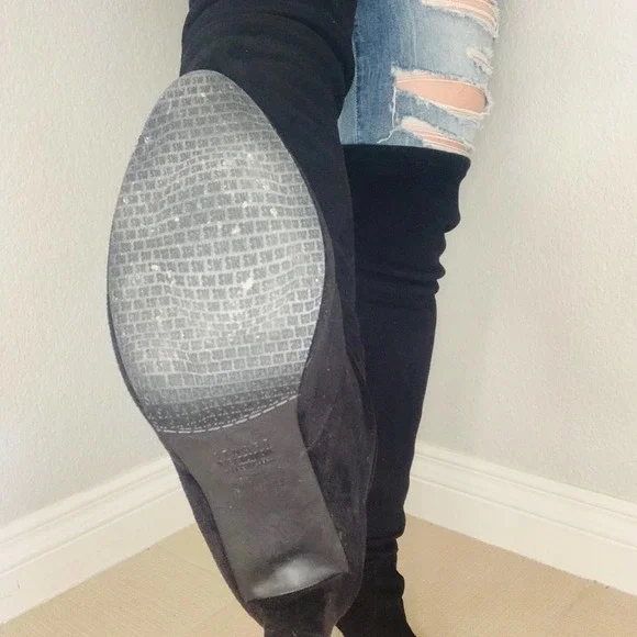 Stuart weitzmanCeleb Cukt following favorite Black suede knee high bootsAlmond toePull onTie detail at back3.74" heelLeather upper and lining, TPU soleGreat condition no stains or marks on suede, shows very light use in soles. No strings ties elastic at top of boots holds from slipping
