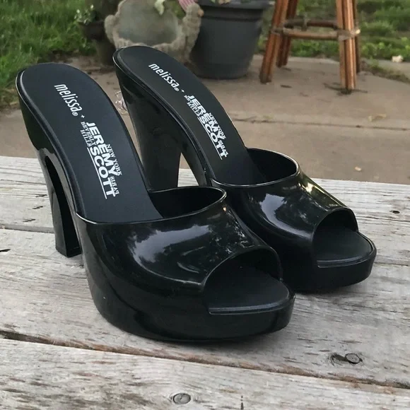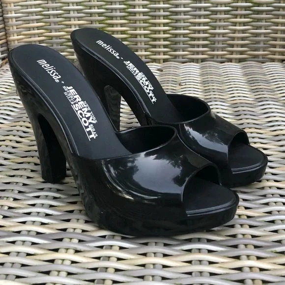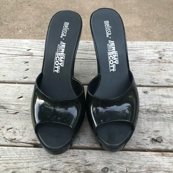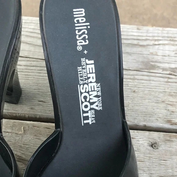This is a pair of inflatable (not really) blow up heels by Jeremy Scott and Melissa. Made out of jelly plastic in solid black. Lightly worn with some scuffing on inner vamps from...