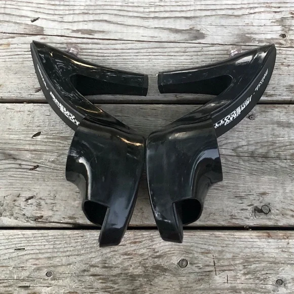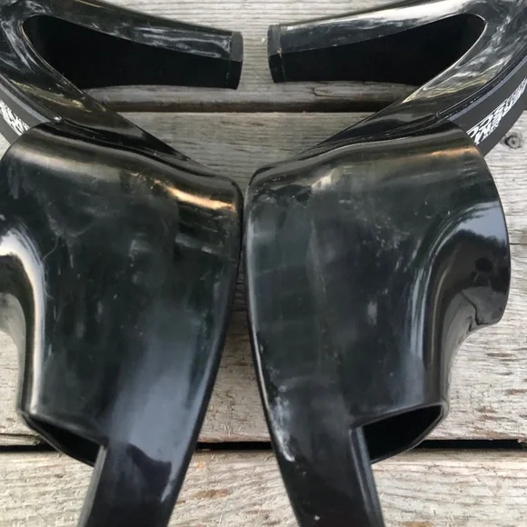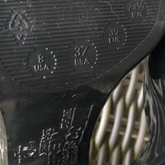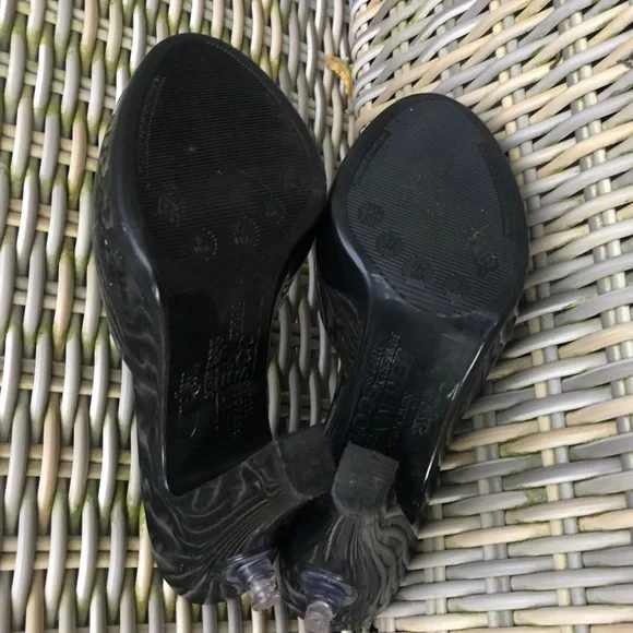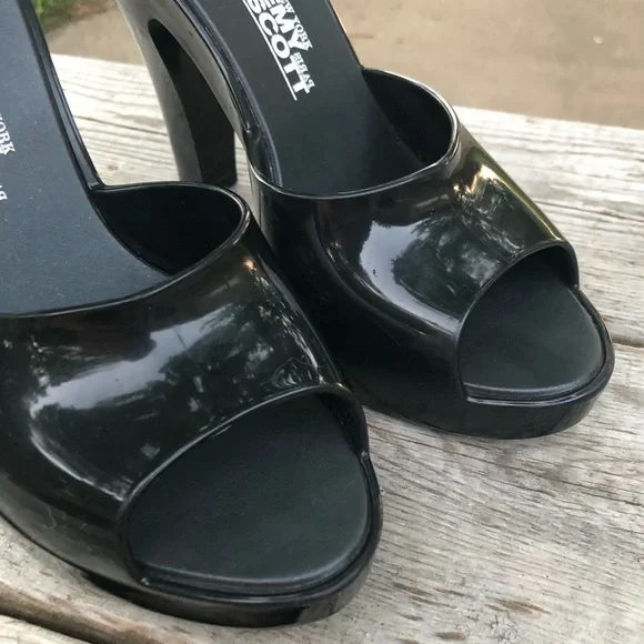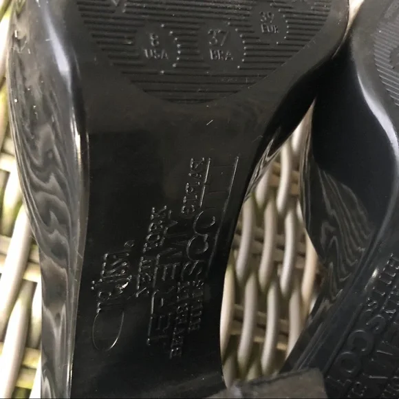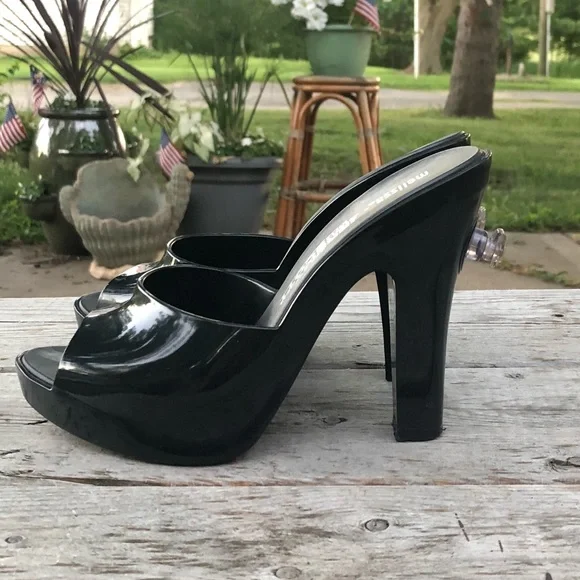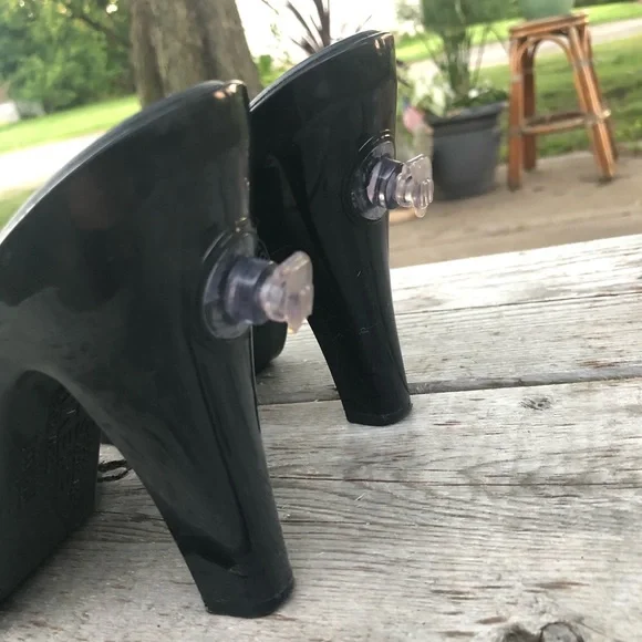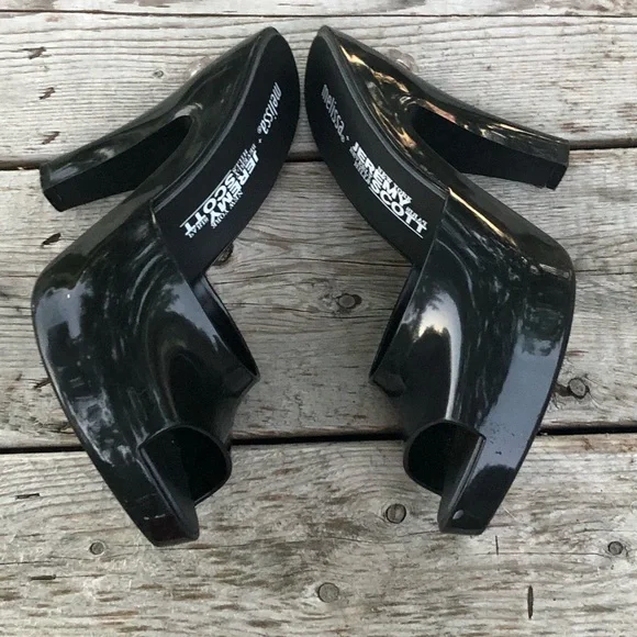 This is a pair of inflatable (not really) blow up heels by Jeremy Scott and Melissa. Made out of jelly plastic in solid black. Lightly worn with some scuffing on inner vamps from rubbing against each other, see last pic.