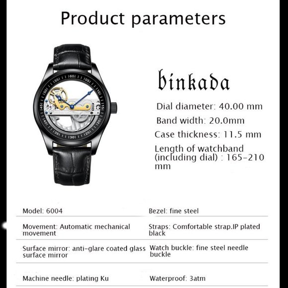 Binkada 2021New pattern Designer LuxuryMechanical Wristwatch Superior Quality Stainless Steel GMT Top Brand Men Watches RelojItem DescriptionMain Feature:Mechanical watch-Automatic chain- 100% New With Tag And High Quality;- 3ATM / 30M Water Resistant (Support Cold Shower and Swim, do not operate watch when underwater, Do not support hot water)Brand Name: BINKADAWatchcase material:stainless steelBand Material: cowhideThe thickness of the watch:11mmDial Diameter: 41mmBand Length: