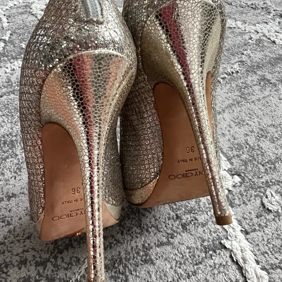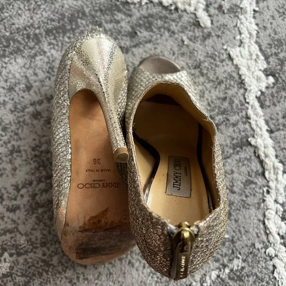 Beautiful Jimmy Choo glittery open toe booties! Overall great condition but there are some areas of wear. I tried to post detailed photos so please take a close look! There is one area where the netting has come loose and frayed. Another small area where there is slight orangey discoloration. Please let me know if you have any questions! Size is 36!! Please know your size!! No returns or refunds!!