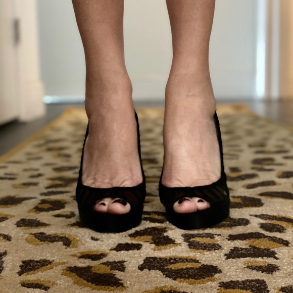 Peep Toe Platform Stiletto. These shoes have a slight tear on the left shoe near pinky toe.