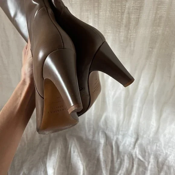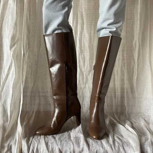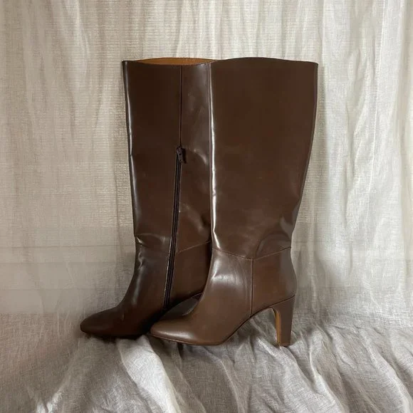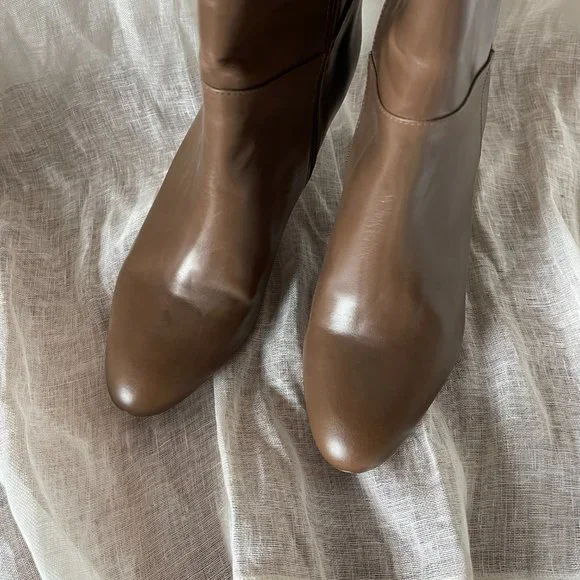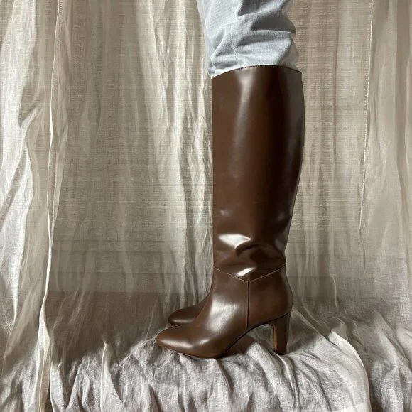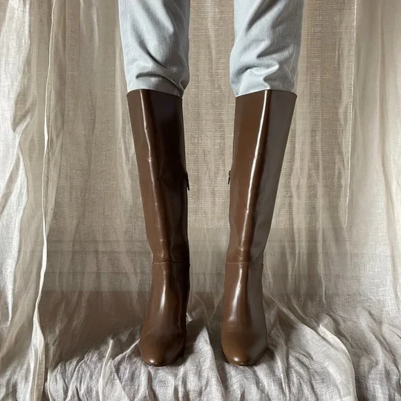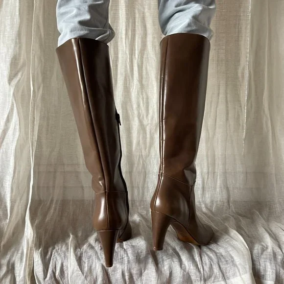 Knee High faux leather boots from french brand, Sezane in a light brown colorexcellent condition, only worn once with no visible signs of wearsize: 40/ US 9heel height: 3”shaft: 16” from ankle base