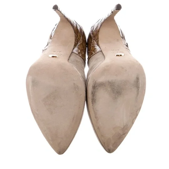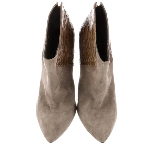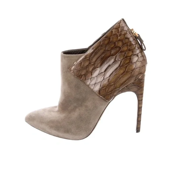 Sergio Rossi leather animal print boots.Pointed-ToesStiletto heelsExposed zipper closure at anklesHeels: 4.5”NeutralsGood Conditions, moderate creasing at vamps; light...