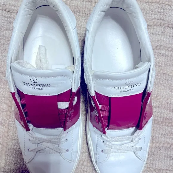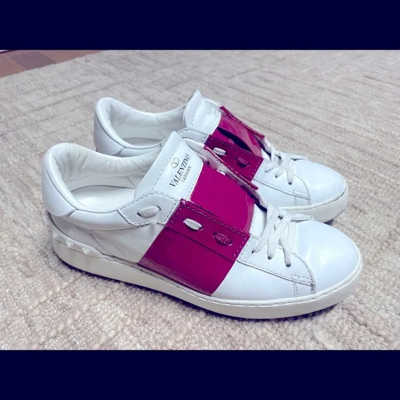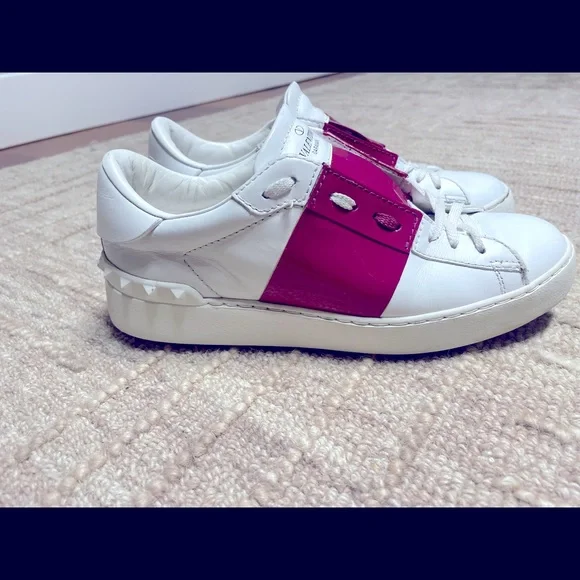 AUTHENTIC Valentino GaravaniROCKSTUD UNTITLED SNEAKER IN CALFSKIN LEATHER WITH BURGUNDY STRIPE, no box, comes with original Shoe Bag, Size 7