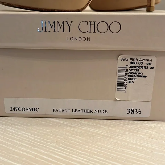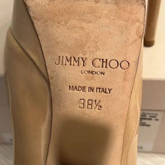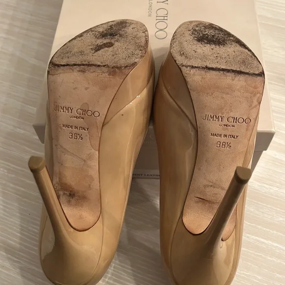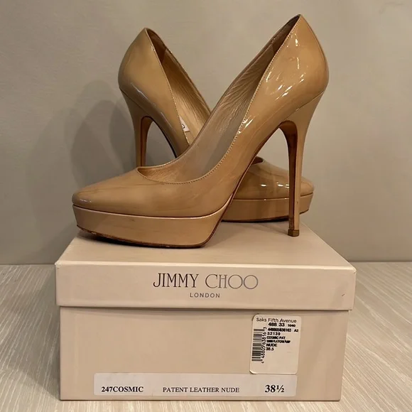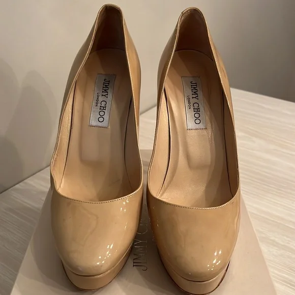 Jimmy Choo patent leather nude platform pump size 38.8 (euro)/ size 8.5 (USA). Moderately used, no scuff marks on heel