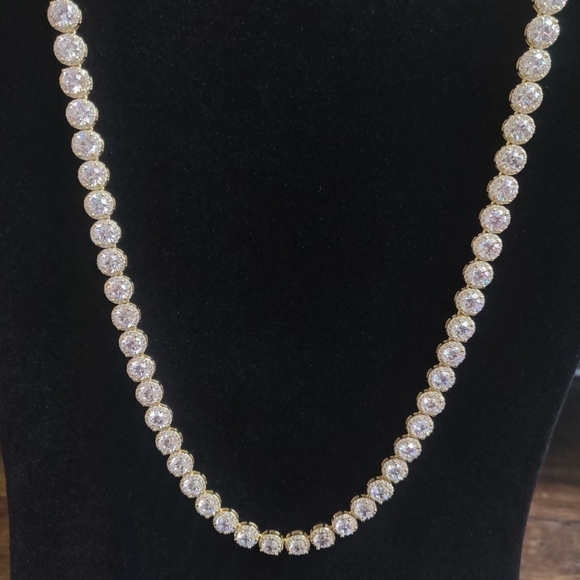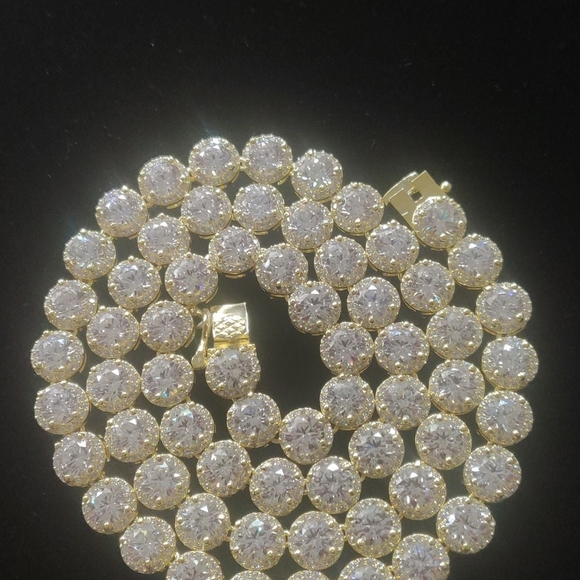 New Icy Gold Finished 22" x 5mm Custom Tennis Chain filled with AAA+ Quality CZ that Deliver a Spectacular Show In The Sun & All Surrounding Light. For Men & Woman!!!Chain Design: Custom Tennis Chain Chain Metal: Brass Chain Plating: Gold FinishedChain Size: 22" x 5mm Chain Features: Anti-Fade-Allergy-Rust
