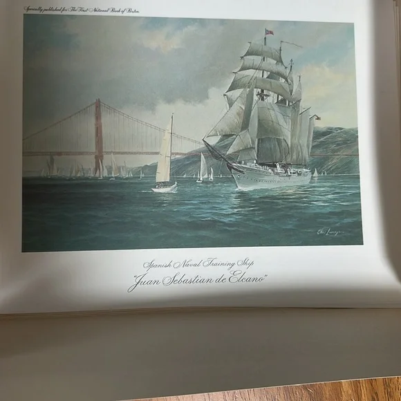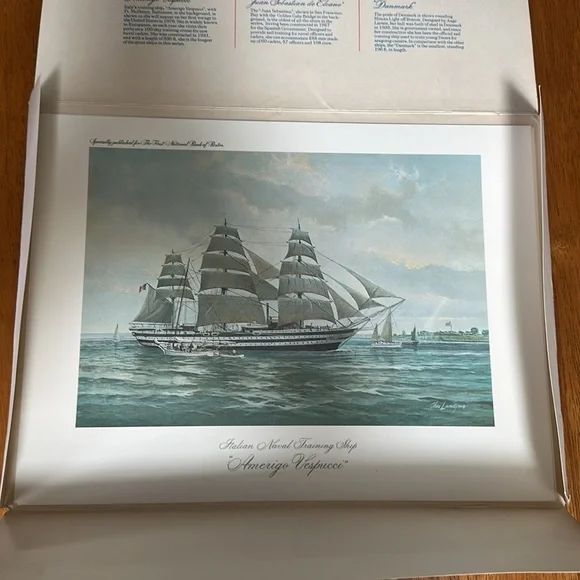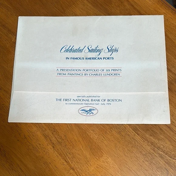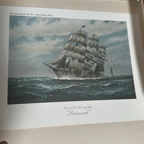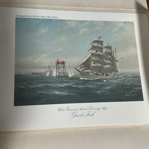 Celebrated sailing ships in Famous American Ports by Charles Lundgren. To commemorate operation sail in July of 1976. The six prints are the Eagle, American Vespucci, Christian Radich, Juan Sebastian de Elcano, Gorch Fock, Danmark. These prints are stunning and should be mounted but with or centennial coming up I hate to break up the set. 12x9 prints.