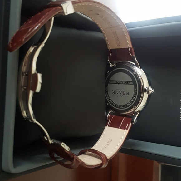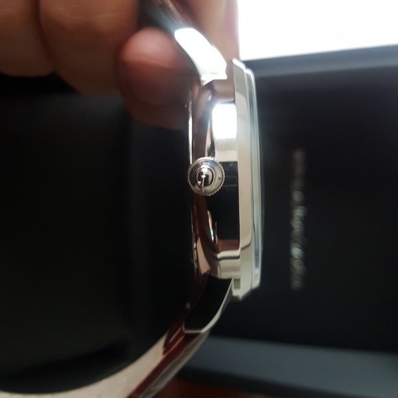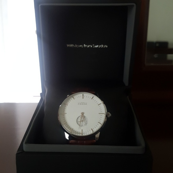 White/ Silver dial watch with brown leather strap and butterfly clasp. Worn only on two occasions so brand new and in box.