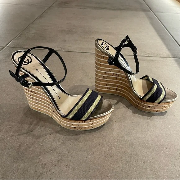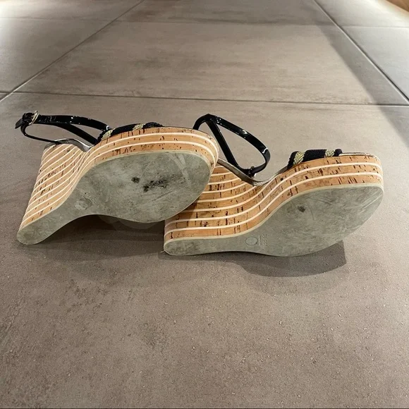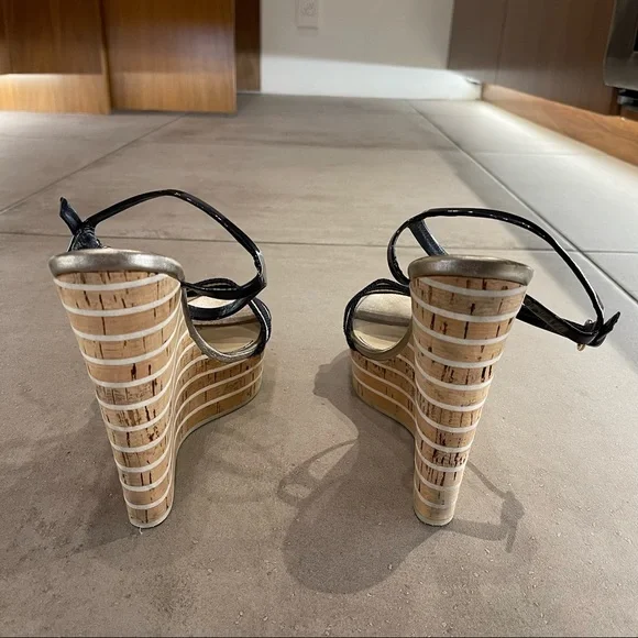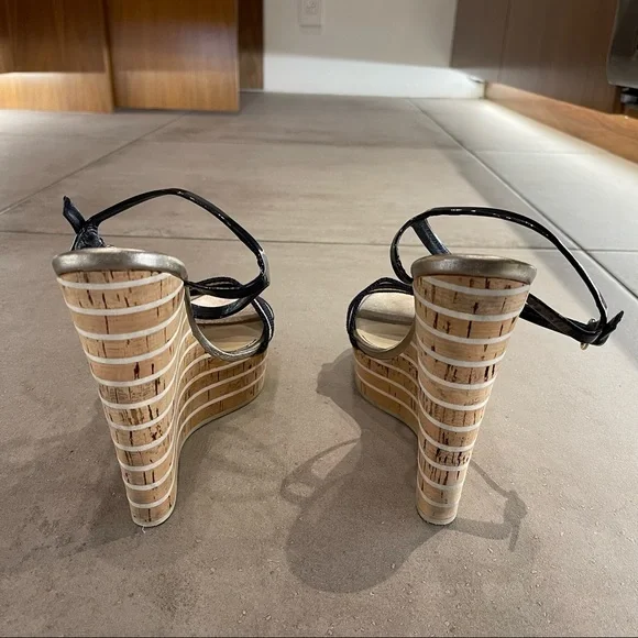 Beautiful corkers wedged sandalsGreat condition, with black and gold detail on the toePatent Leather ankle strapSize 41.5Heel Height 5.75”Toe Platform is 1.25”Contact me with any questions