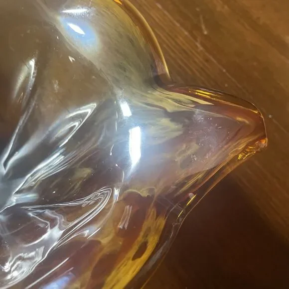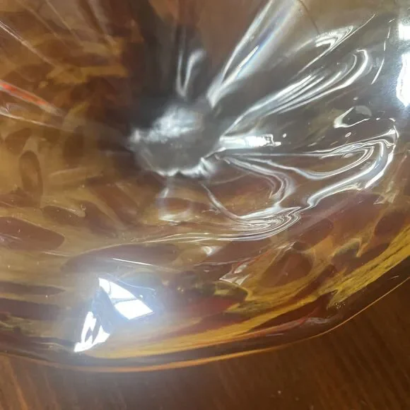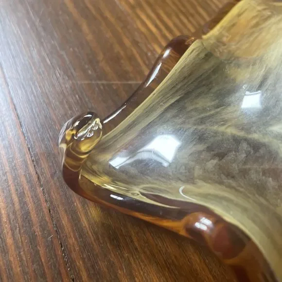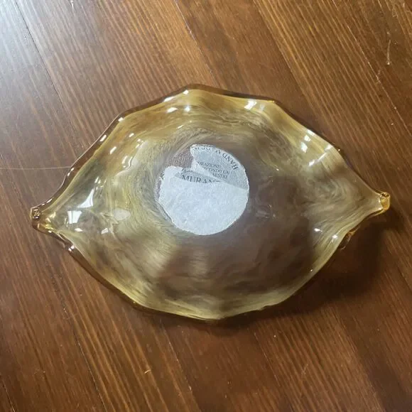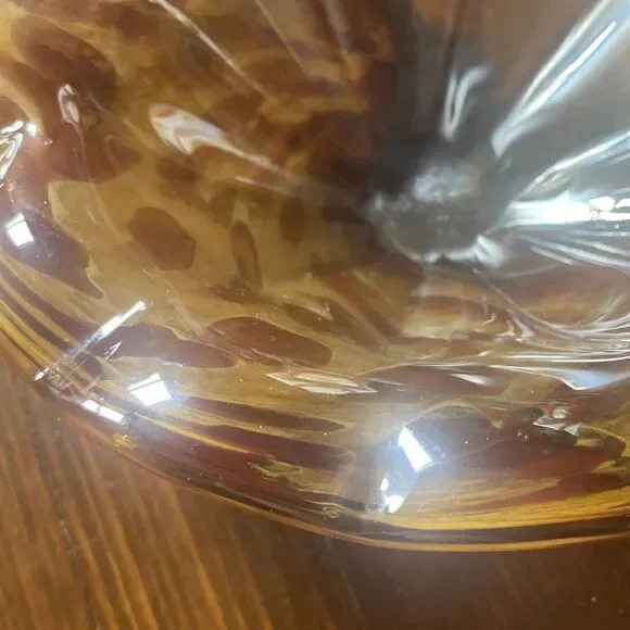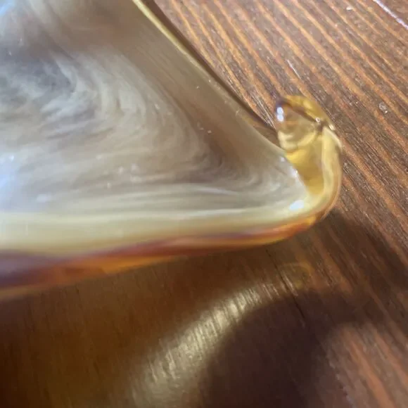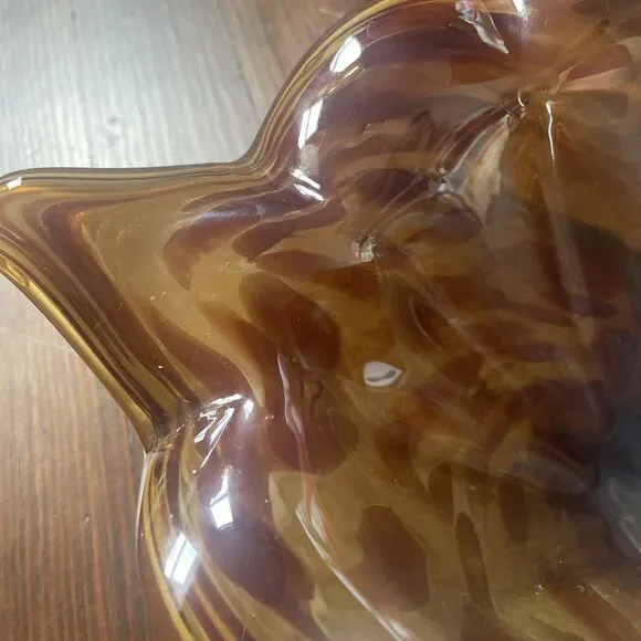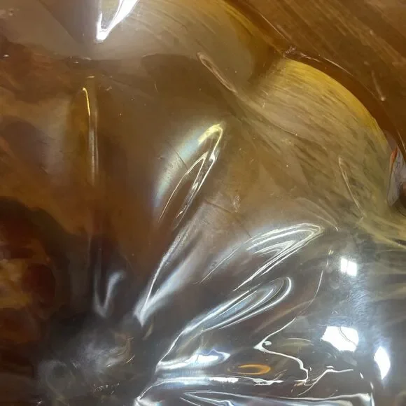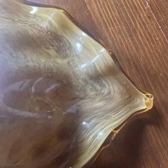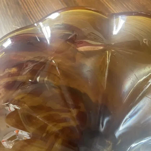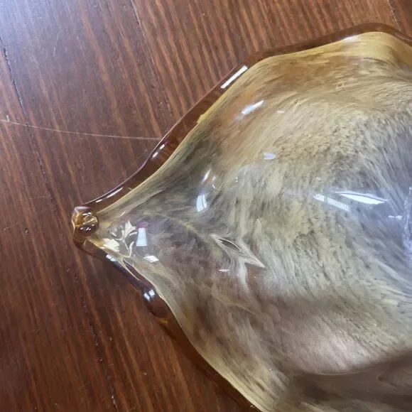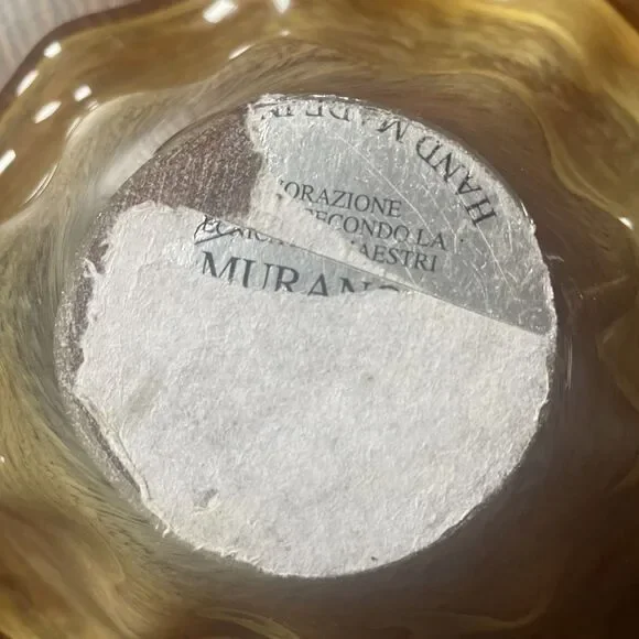 This stunning Murano Made in Italy glass abstract bowl features a beautiful brown, tan, and gold color scheme with a swirl pattern, showcasing the artistry of hand-blown glassmaking technique. The glossy finish adds a touch of elegance to this vintage piece, perfect for all occasions as a unique and stylish addition to any decor. The intricate design and craftsmanship make it a standout piece for adults´ department, reflecting the tradition and creativity of Murano glassmaking artistry.Sticker on bottom stating Murano is damaged.Measures 11 x 7.5 x 3.5"
