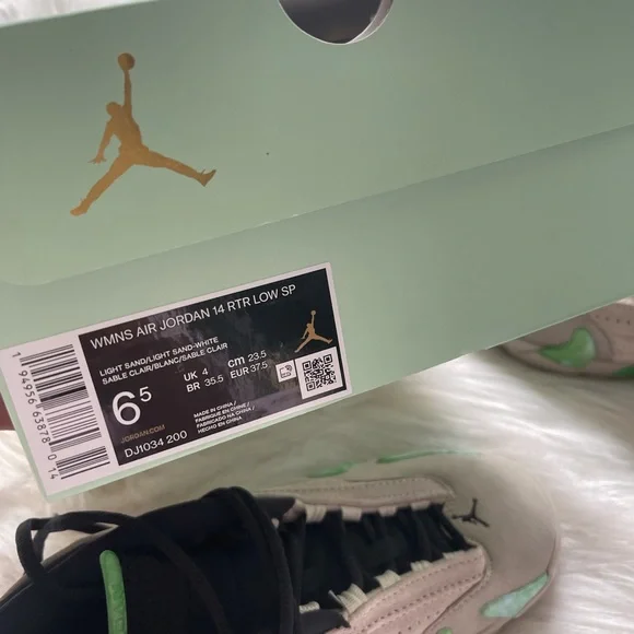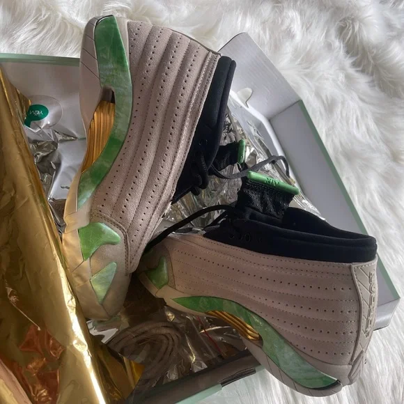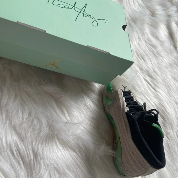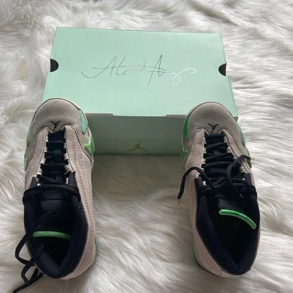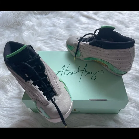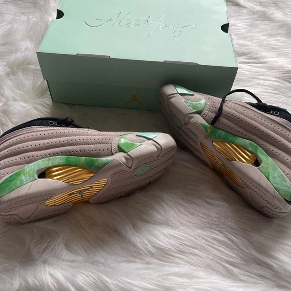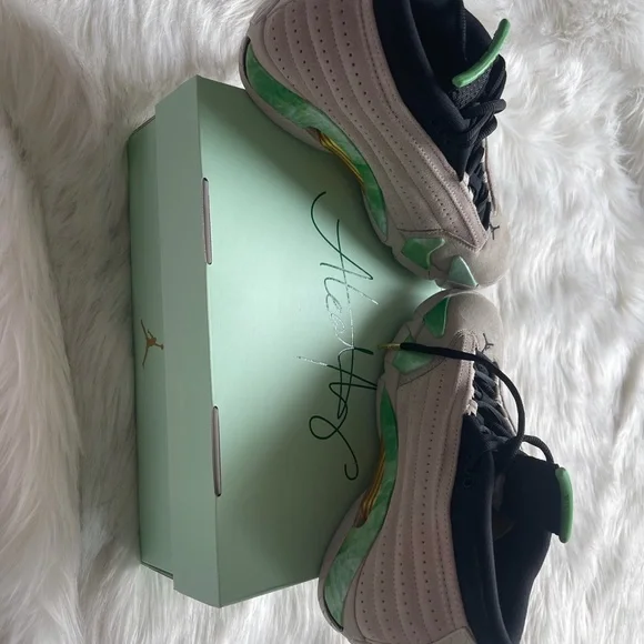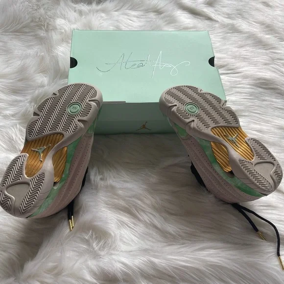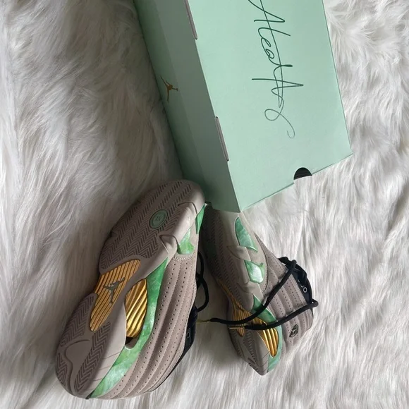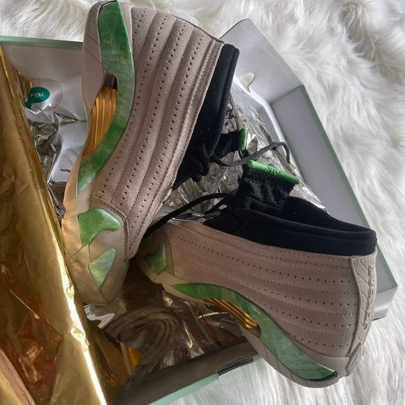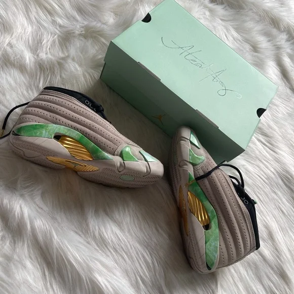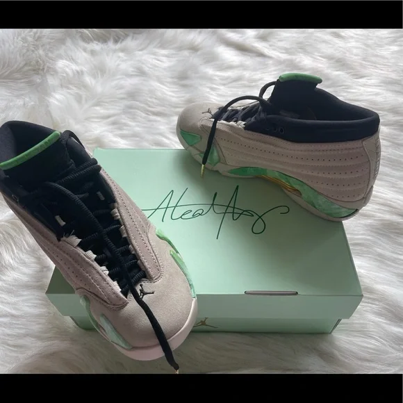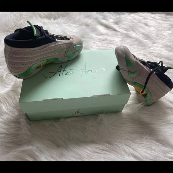 AUTHENTIC. QR code on original shoe box!!! The Aleali May x Women’s Air Jordan 14 Low “Fortune” is an August 2021 collaboration that pairs the celebrity stylist with Jordan Brand on the low-top version of Michael Jordan’s fourteenth signature shoe. Now five collaborations in with Jordan, Aleali May is one of the most successful sneaker designers in the game today, and it’s quite easy to see why on her “Fortune” colorway of the Jordan 14 Low. Like May’s other Air Jordan styles, the “Fortune” has a personal connection to the Los Angeles native and is inspired by her heritage. The upper appears in Light Sand suede for a premium look. May retains the Air Jordan 14’s original “Ferrari-inspired” Jumpman logo on the side and designs the “Jordan” detailing on the spine in a tonal hue that jives with the tan upper. Jade accents on the midsole with a metallic gold shank plate are a nod to the very first piece of jewelry May ever owned, which was gifted to her by her grandmother. Release date: August 19, 2021ONLY WORN ONCE for a 30 min photoshootOriginal shoe box and extra laces included.