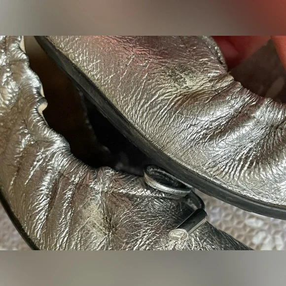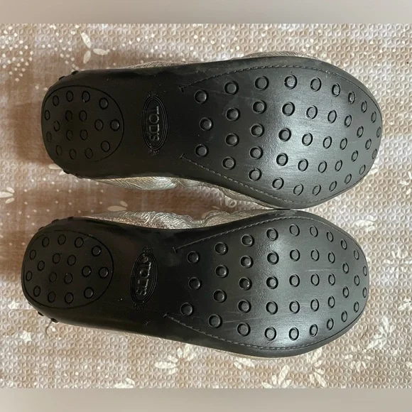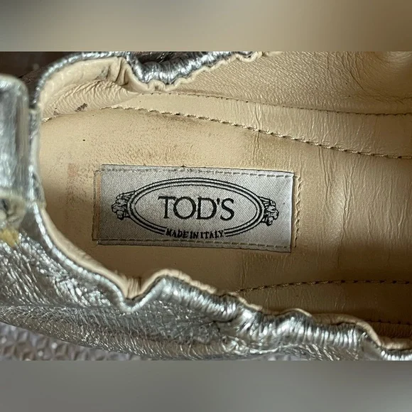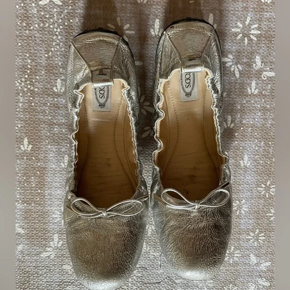 Luxury ballerina flats from Tod’s. Famous for their combination of style and comfort. Worn a few times but they were the wrong size for me - see photos for slight discoloration on sides and toes. European SizeMade In ItalyColor/Material: Silver LeatherDesign Details: Bow AccentLightly Padded Leather InsoleMan-Made Sole